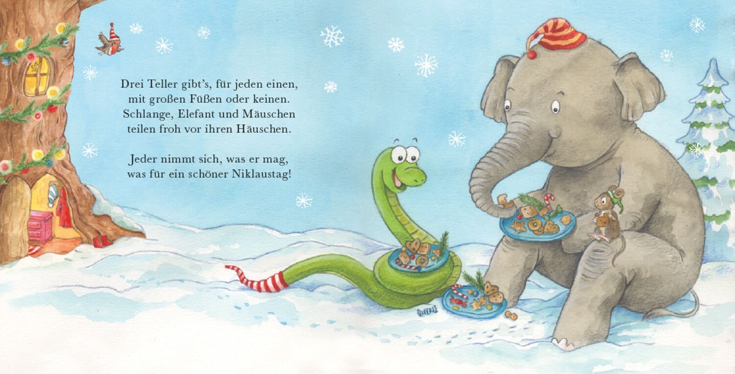 Wie aufregend morgen kommt der Nikolaus! Fröhlich stellt die kleine Maus ihre frisch geputzten Stiefelchen raus. Auch der Elefant vom Nachbarhaus stellt seine Schuhe vor die Tür. Doch Moment mal, denkt die Maus, da passt ja zehnmal mehr hinein! Bekommen die g...