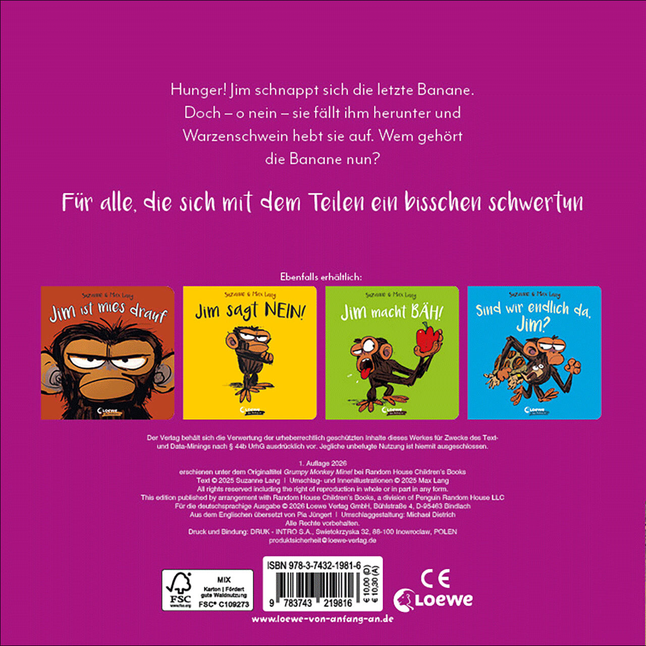 Loewe-Bücher: garantiert ohne KI Hunger! Jim hat sich die letzte Banane geschnappt. Doch oh nein sie fällt ihm herunter und Warzenschwein hebt sie auf. Wem gehört die Banane nun? Für alle, die sich mit dem Teilen ein bisschen schwertun! Witziges Pappbilderbuch...