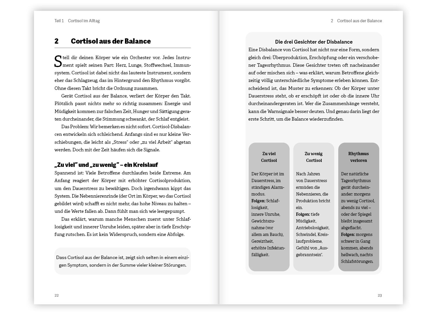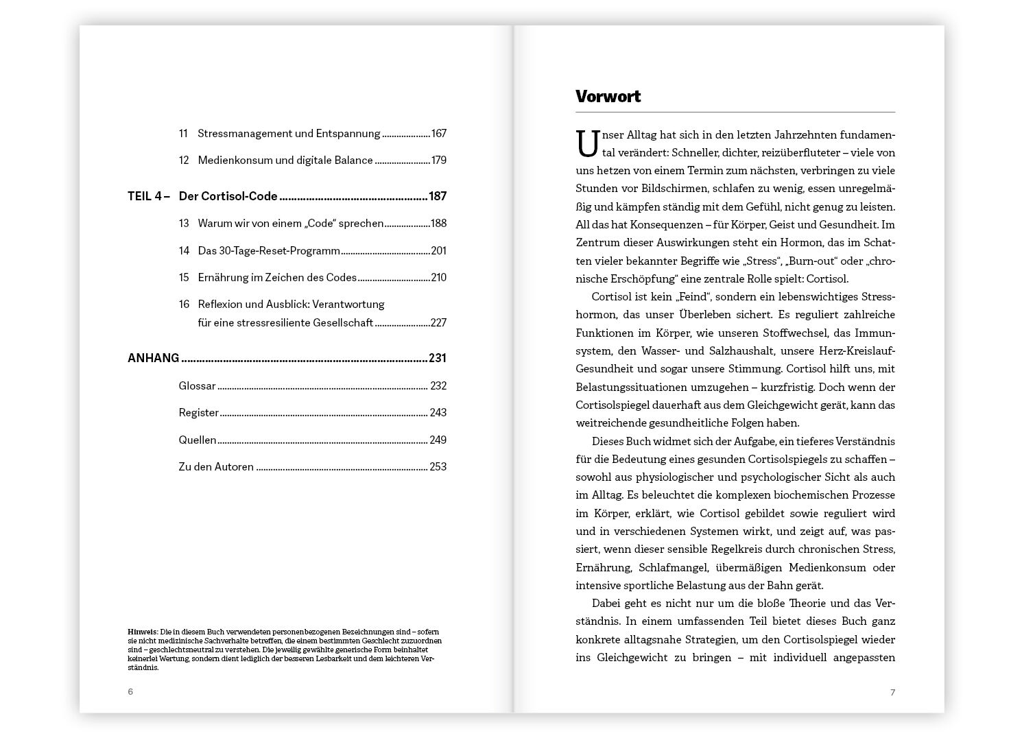 VORWORT Unser Alltag hat sich in den letzten Jahrzehnten fundamental verändert: Schneller, dichter, reizüberfluteter viele von uns hetzen von einem Termin zum nächsten, verbringen zu viele Stunden vor Bildschirmen, schlafen zu wenig, essen unregelmäßig und kämpfen ständig mit dem Gefühl, nicht genug zu leisten. All das hat Konsequenzen für Körper, Geist und Gesundheit. Im Zentrum dieser Auswirkungen steht ein Hormon, das im Schatten vieler bekannter Begriffe wie Stress, Burn-out oder chronische Erschöpfung eine zentrale Rolle spielt: Cortisol. Cortisol ist kein Feind, sondern ein lebenswichtiges Stresshormon, das unser Überleben sichert. Es reguliert zahlreiche Funktionen im Körper, wie unseren Stoffwechsel, das Immunsystem, den Wasser- und Salzhaushalt, unsere Herz-Kreislauf- Gesundheit und sogar unsere Stimmung. Cortisol hilft uns, mit Belastungssituationen umzugehen kurzfristig. Doch wenn der Cortisolspiegel dauerhaft aus dem Gleichgewicht gerät, kann das weitreichende gesundheitliche Folgen haben. Dieses Buch widmet sich der Aufgabe, ein tieferes Verständnis für die Bedeutung eines gesunden Cortisolspiegels zu schaffen sowohl aus physiologischer und psychologischer Sicht als auch im Alltag. Es beleuchtet die komplexen biochemischen Prozesse im Körper, erklärt, wie Cortisol gebildet sowie reguliert wird und in verschiedenen Systemen wirkt, und zeigt auf, was passiert, wenn dieser sensible Regelkreis durch chronischen Stress, Ernährung, Schlafmangel, übermäßigen Medienkonsum oder intensive sportliche Belastung aus der Bahn gerät. Dabei geht es nicht nur um die bloße Theorie und das Verständnis. In einem umfassenden Teil bietet dieses Buch ganz konkrete alltagsnahe Strategien, um den Cortisolspiegel wieder ins Gleichgewicht zu bringen mit individuell angepassten Ernährungsplänen, gezielten Bewegungskonzepten, entspannungsfördernden Methoden und einem 30-Tage-Programm, das schrittweise zur nachhaltigen Regulation beiträgt. Auch Kinder, deren Cortisolsystem besonders sensibel auf äußere Einflüsse reagiert, finden in in diesem Buch besondere Berücksichtigung. Cortisol ist ein zentrales Instrument des Körpers doch wie bei jedem fein abgestimmten Instrument entscheidet das richtige Maß über Harmonie oder Disharmonie. Dieses Buch soll ein Wegweiser sein, dieses Maß (wieder) zu finden. Es richtet sich an alle, die spüren, dass ihr Leben zu stressreich geworden ist, an Gesundheitsbewusste, die vorbeugen wollen, an Eltern, an Fachleute im Gesundheitsbereich und an jene, die präventiv handeln möchten, bevor der Körper in eine Überlastungsspirale gerät. Das gilt auch für Entscheidungsträger, wie etwa aus Politik und Wirtschaft. In einer Zeit, in der Stress zur neuen Normalität geworden ist, braucht es mehr denn je Wissen, Bewusstsein und Werkzeuge, um die eigene innere Balance zu schützen und genau dazu möchte dieses Buch beitragen. Es soll Mut machen, Verantwortung zu übernehmen, Zusammenhänge zu verstehen und praktische Schritte zu gehen hin zu mehr Energie, Gesundheit und Resilienz für alle Gesellschaftsmitglieder. Wir laden dich ein, mit Neugier und Offenheit in die Welt des Cortisols einzutauchen und vielleicht nicht nur ein Hormon und die eigenen Einflussmöglichkeiten besser kennenzulernen, sondern mit einem entsprechend sensibilisierten Blick auch dich selbst. Svea Golinske und Dr. med. Peter Heilmeyer
