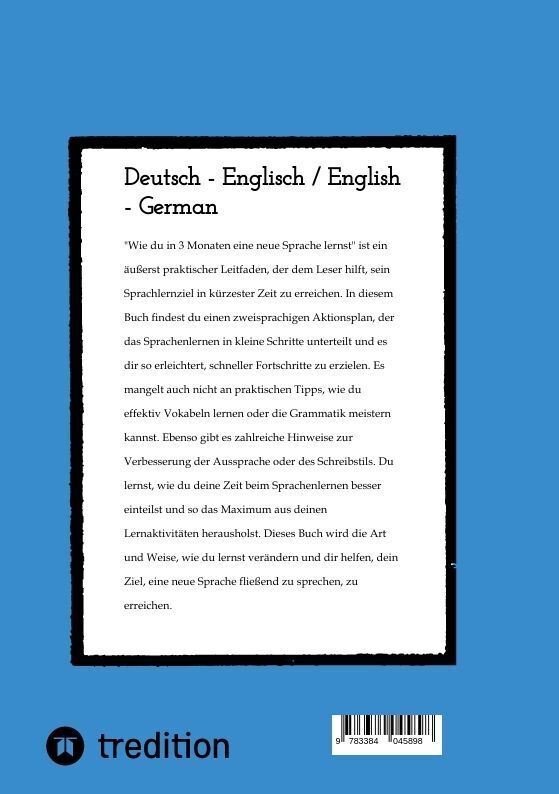 "Wie du in 3 Monaten eine neue Sprache lernst" ist ein äußerst praktischer Leitfaden, der dem Leser hilft, sein Sprachlernziel in kürzester Zeit zu erreichen. In diesem Buch findest du einen zweisprachigen Aktionsplan, der das Sprachenlernen in kleine Schritte...