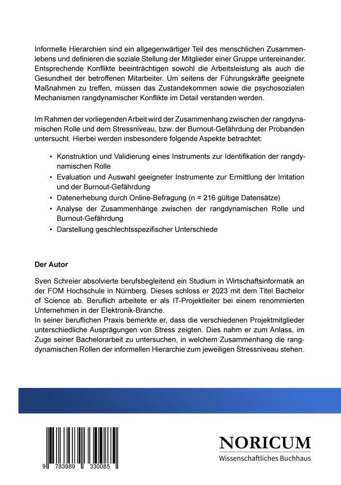 Im Rahmen der vorliegenden Bachelor-Arbeit wird der Zusammenhang zwischen der rangdyna- mischen Rolle und dem Stressniveau, bzw. der Burnout-Gefährdung der Probanden untersucht. Hierbei werden insbesondere folgende Aspekte betrachtet: • Konstruktion und V...