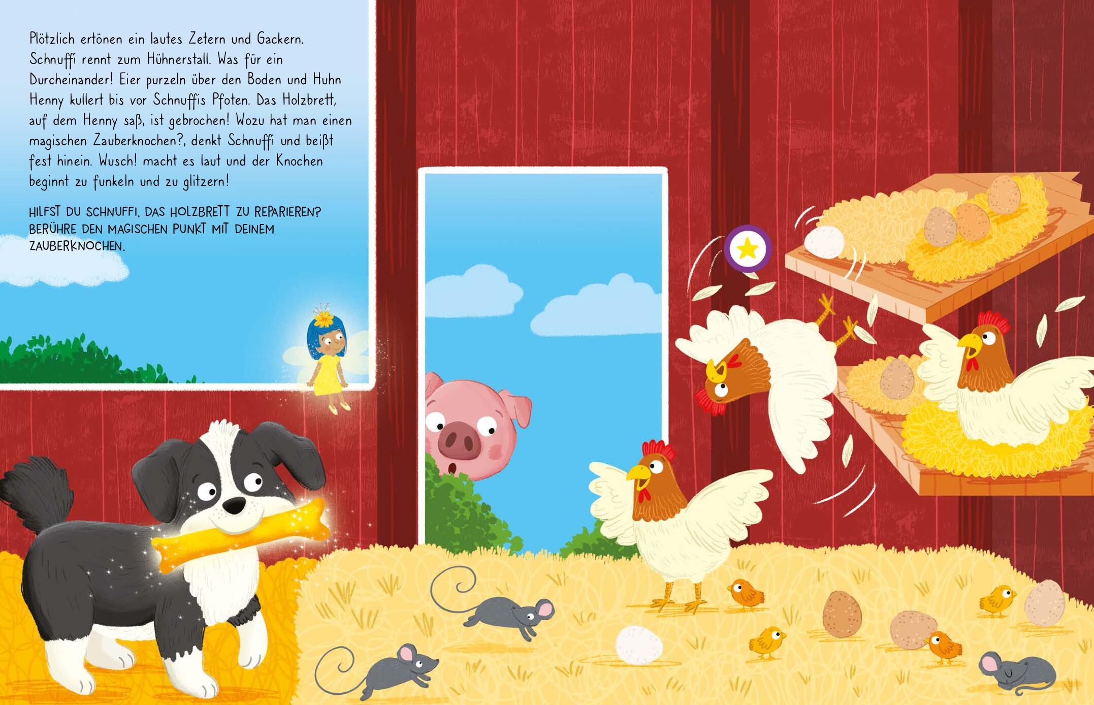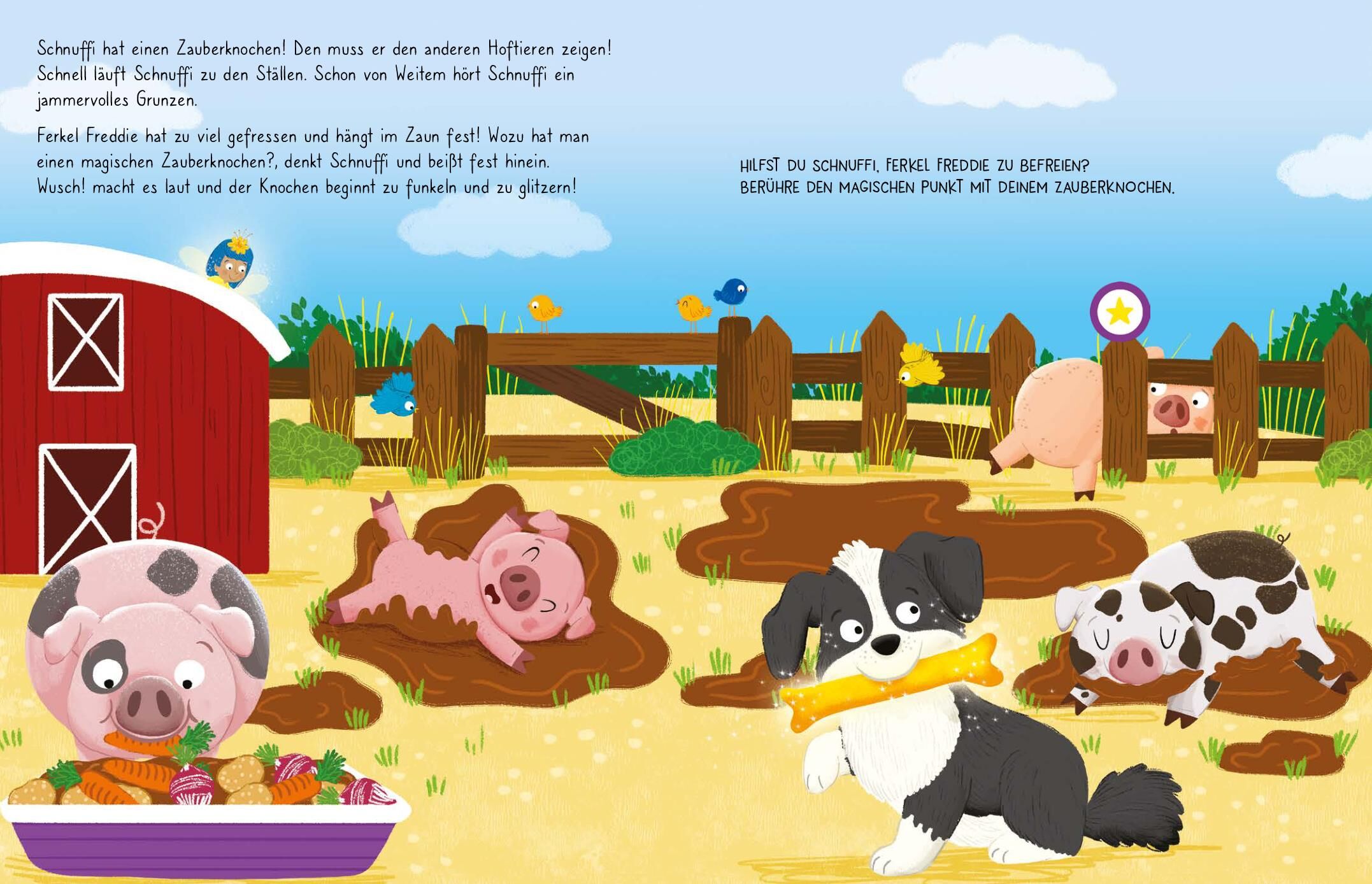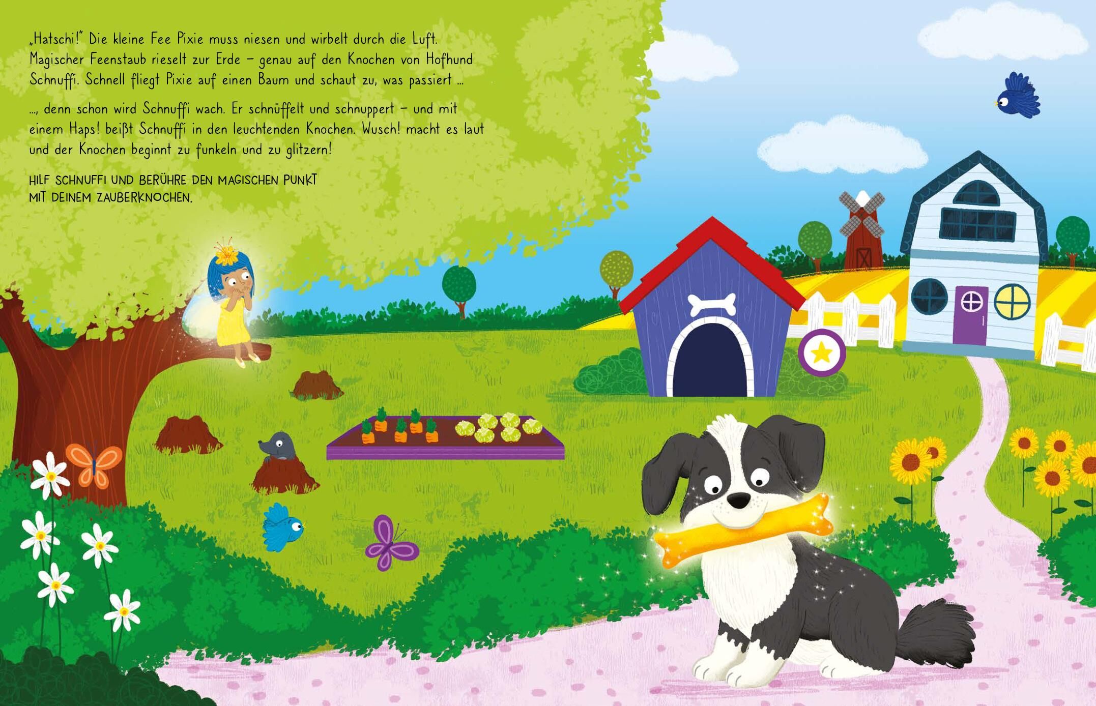 Magie zum Anfassen und Hören Interaktiver Spaß für kleine Zauberinnen und Zauberer! Entdecke die zauberhafte Welt von Hofhund Schnuf fi und seiner neuen, funkelnden Entdeckung dem Zauberknochen ! Hatschi!, nießt die kleine Fee Pixie und magischer Feenstaub ri...