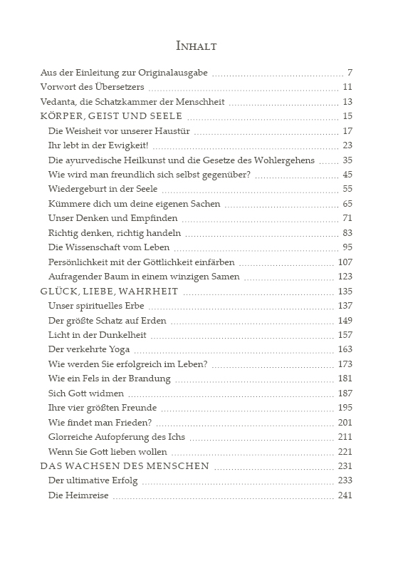 Das Buch besteht aus Mitschriften von 36 Vorträgen, die er über mehrere Jahre in verschiedenen westlichen Ländern gehalten hat. In diesen Vorträgen erklärte er seinen Zuhörern liebevoll und mit großer Leidenschaft den Kern der Philosophie des Vedanta und gab ihnen praktische Hinweise, wie sie die Erkenntnisse der Wissenschaft des Bewusstseins dafür nutzen können, ein glückliches und erfülltes Leben zu führen.