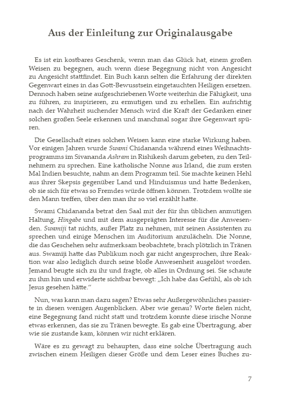 Es ist ein kostbares Geschenk, wenn man das Glück hat, einem großen Weisen zu begegnen, auch wenn diese Begegnung nicht von Angesicht zu Angesicht stattfindet. Ein Buch kann selten die Erfahrung der direkten Gegenwart eines in das Gott-Bewusstsein eingetauchten Heiligen ersetzen. Dennoch haben seine aufgeschriebenen Worte weiterhin die Fähigkeit, uns zu führen, zu inspirieren, zu ermutigen und zu erhellen. Ein aufrichtig nach der Wahrheit suchender Mensch wird die Kraft der Gedanken einer solchen großen Seele erkennen und manchmal sogar ihre Gegenwart spüren.