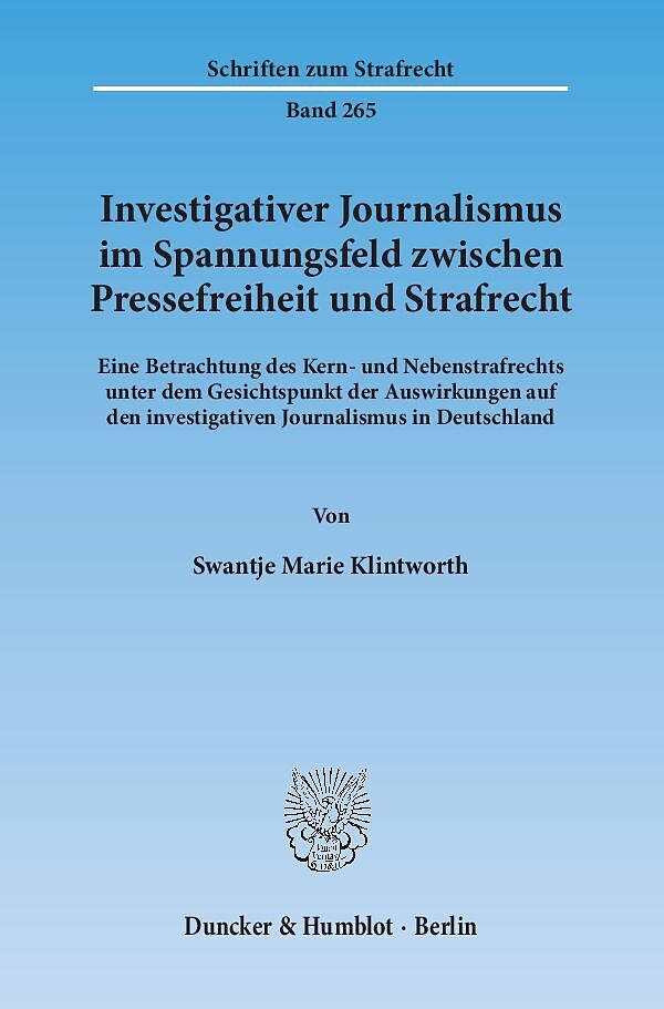 "Die Untersuchung von Klintworth ist eine lesenswerte, wissenschaftlich fundierte Abhandlung über die Strafbarkeitsrisiken im Zusammenhang mit investigativem Journalismus, die auch die Erfordernisse der Praxis vollumfänglich berücksichtigt. Sie ist dabei sowohl für Juristen als auch für Journalisten äußerst empfehlenswert und behandelt alle dogmatisch und praktisch relevanten Fragestellungen auf diesem Feld. Klintworth hat somit nicht nur Mut bewiesen, in dem sie sich dieser spannenden und weitreichenden Materie zuwandte, sondern auch ein Werk geschaffen, das gleichermaßen für Juristen und Journalisten, für Wissenschaft und Praxis einen erheblichen Gewinn bringt." Dr. Markus Mavany, in: Zeitschrift für Internationale Strafrechtsdogmatik, 3/2015