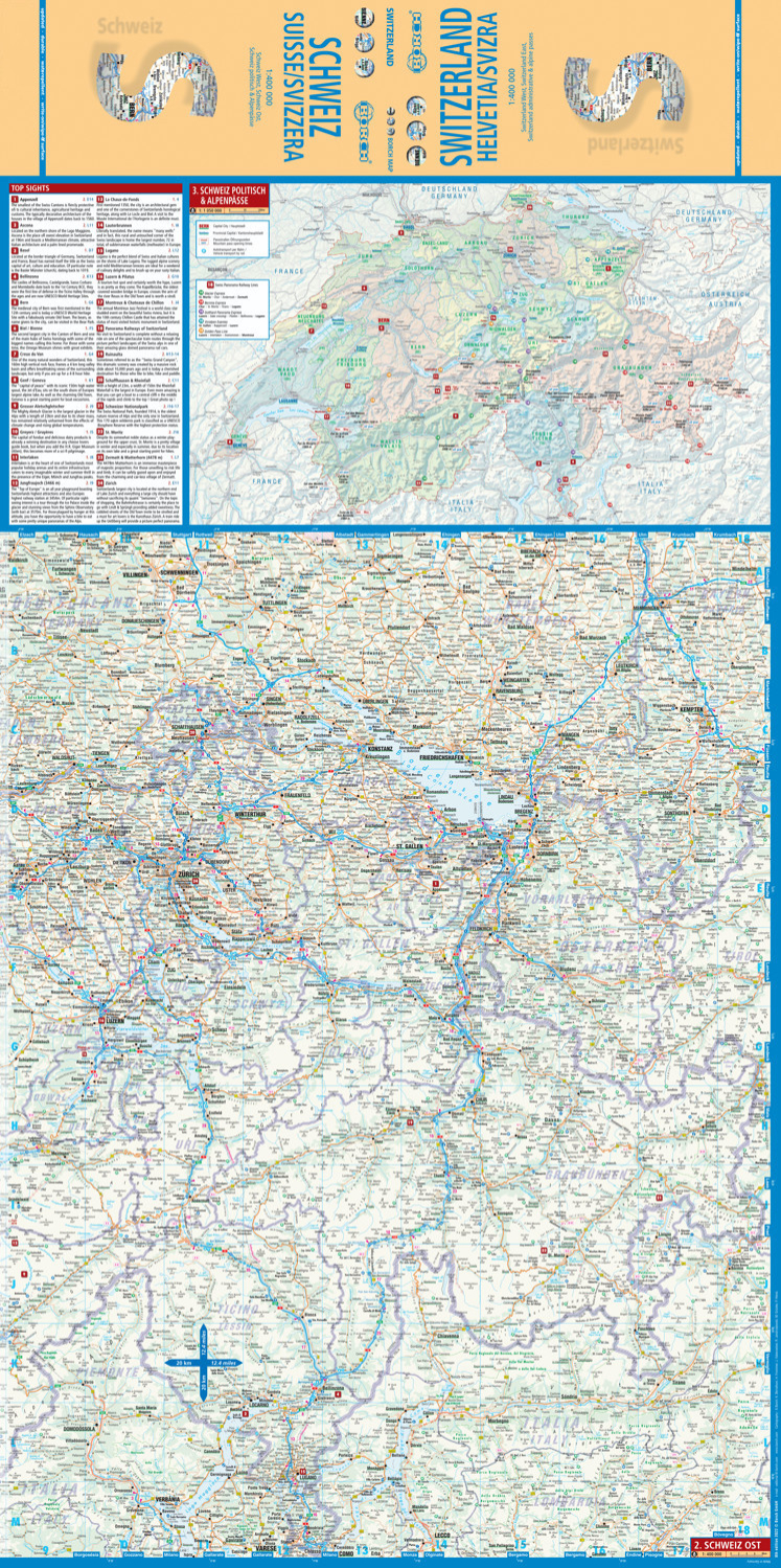 Our laminated and folded Borch Map of Switzerland in the 8th edition contains: Switzerland West 1:400 000, Switzerland East 1:400 000, an administrative map of Switzerland indicating the important Alpine passes and neighboring European countries and an overvie...
