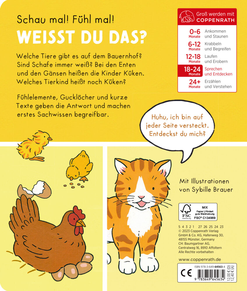 Schau mal! Fühl mal! Weißt du das? Welche Tiere gibt es auf dem Bauernhof? Sind Schafe immer weiß? Bei den Enten und den Gänsen heißen die Kinder Küken. Welches Tierkind heißt noch Küken? Fühlelemente, Gucklöcher und kurze Texte geben die Antwort und machen e...