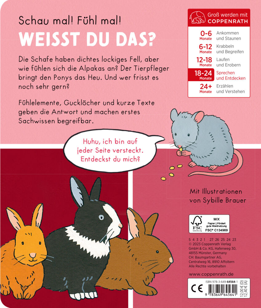 Schau mal! Fühl mal! Weißt du das? Die Schafe haben dichtes, lockiges Fell, aber wie fühlen sich die Alpakas an? Der Tierpfleger bringt den Ponys das Heu. Und wer frisst es noch sehr gern? Fühlelemente, Gucklöcher und kurze Texte geben die Antwort und machen ...