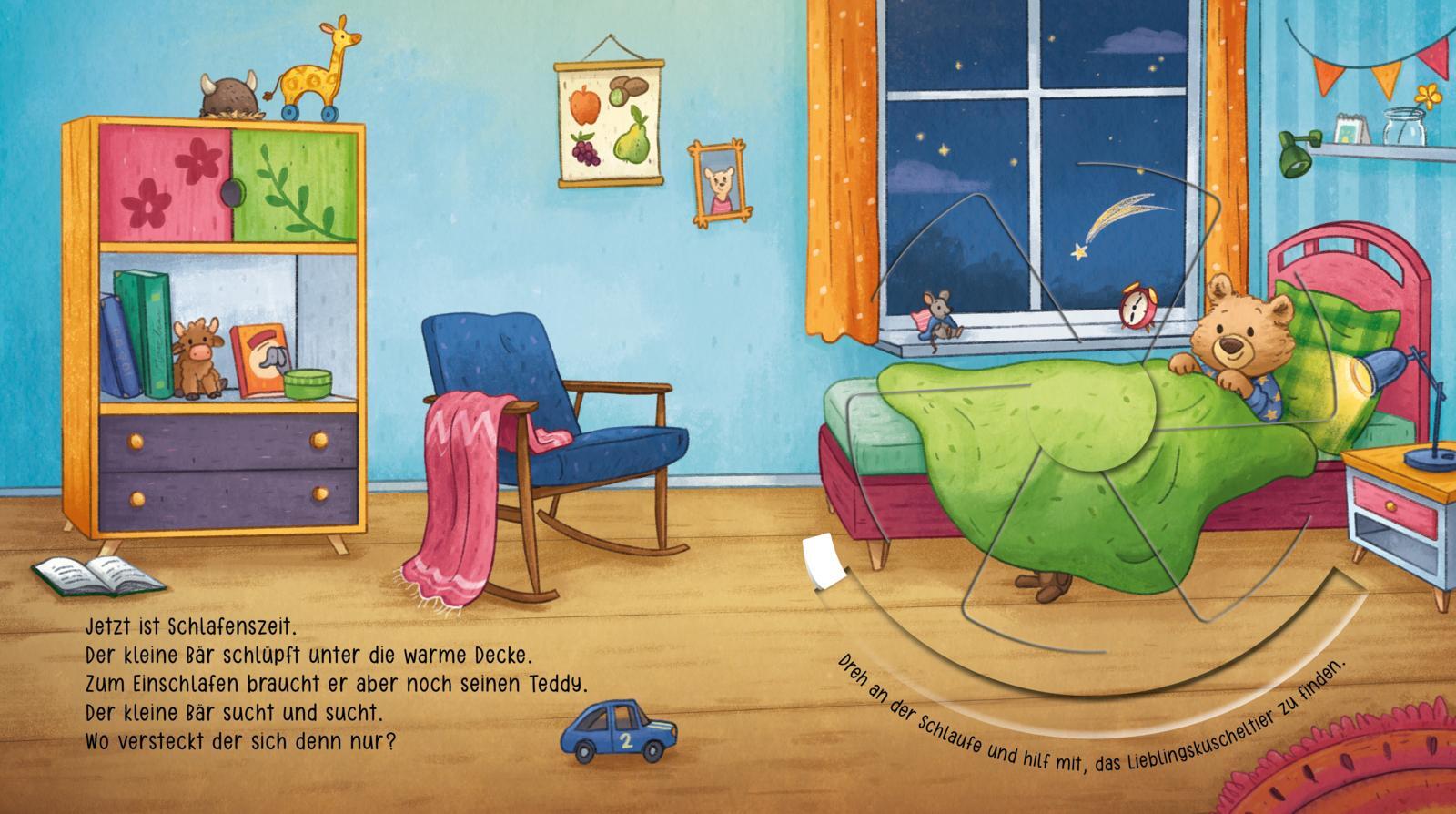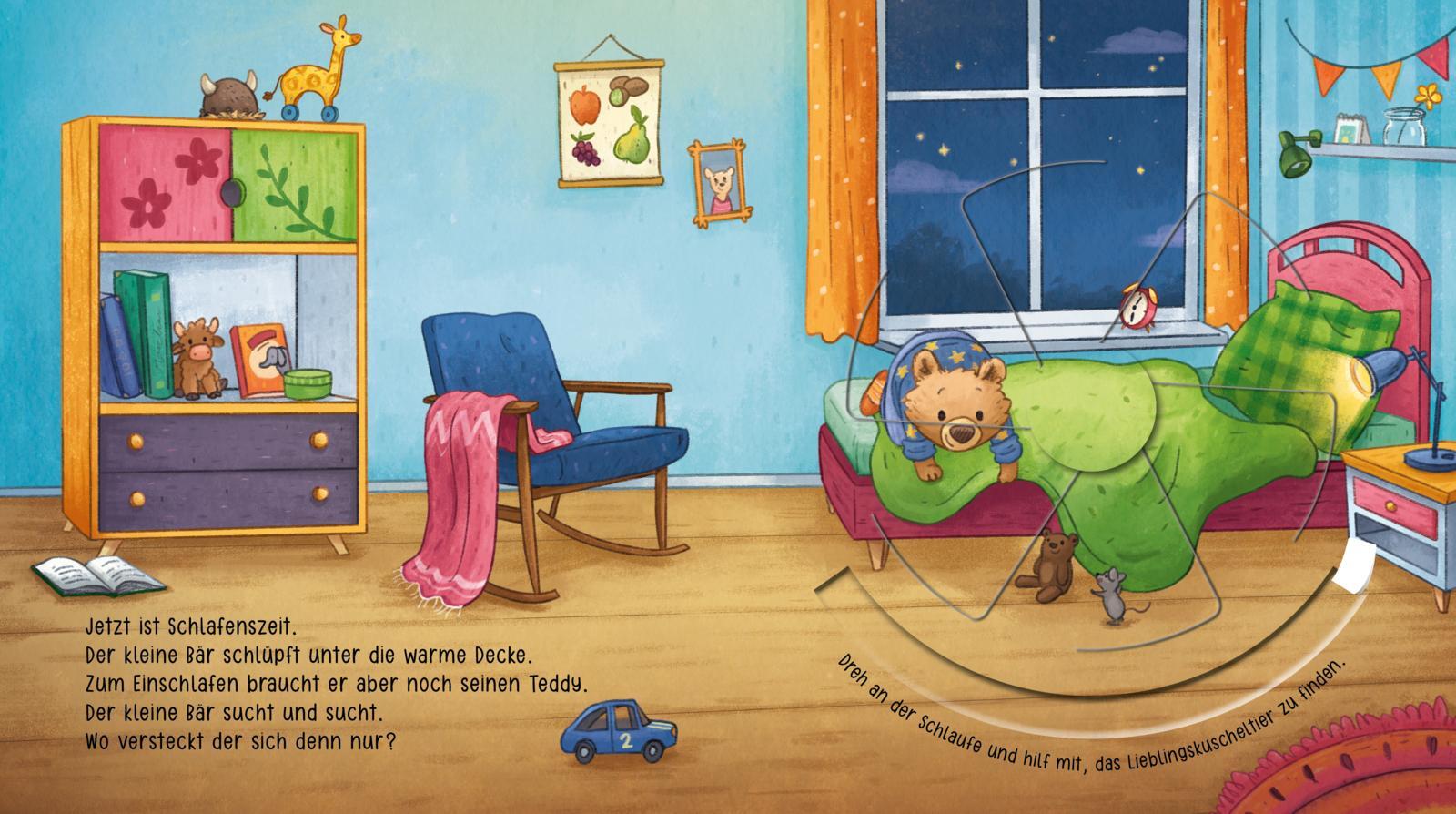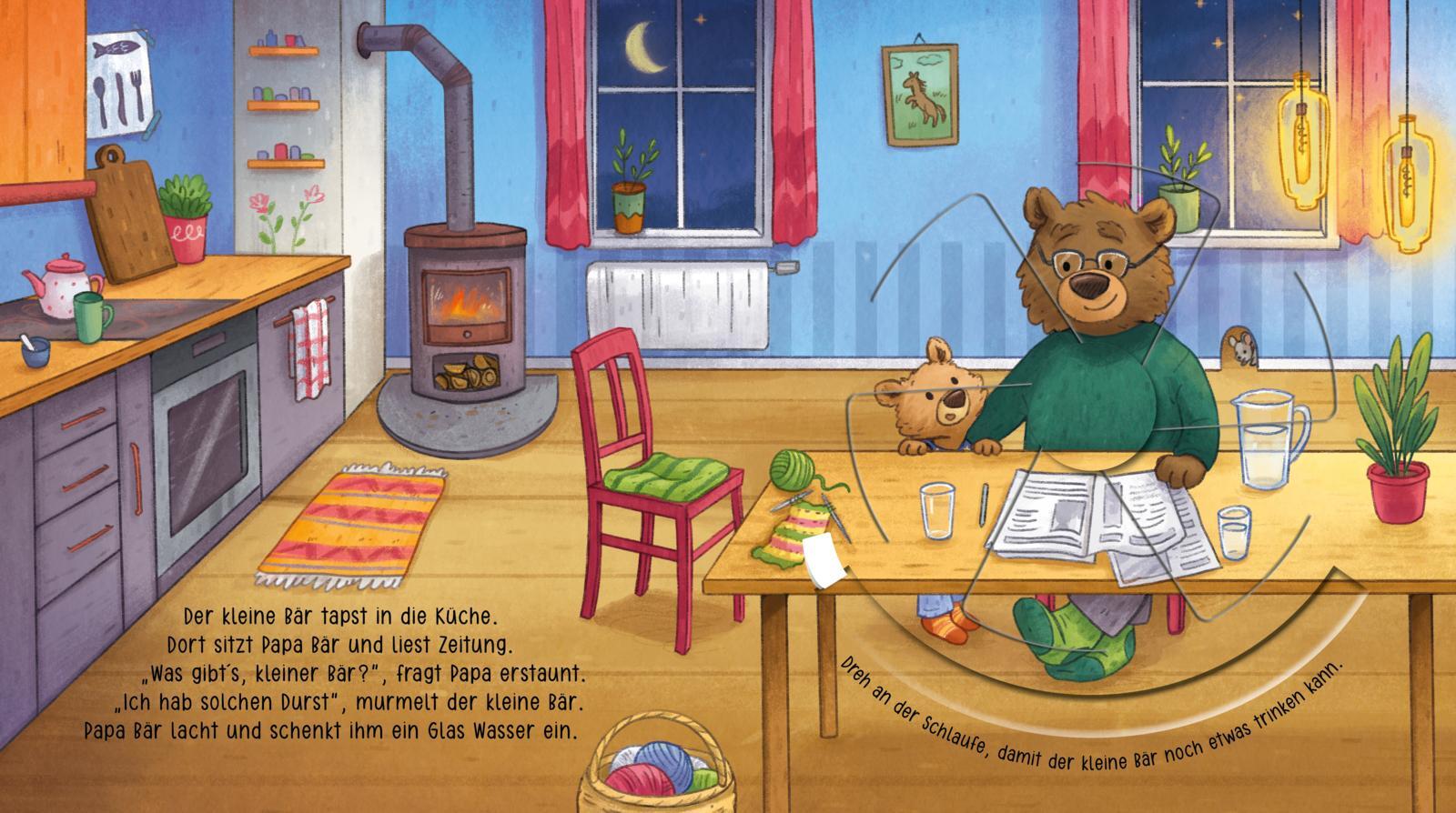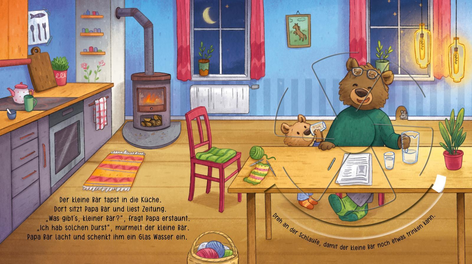 Einmal Drehen und das Bild verändert sich! Bei diesem interaktiven Mitmachbuch können schon die Allerkleinsten ab 18 Monaten in die Rolle der Großen schlüpfen und dem kleinen Bären beim Zubettgehen helfen! Nur einmal an der Schlaufe ziehen und schon hat der k...