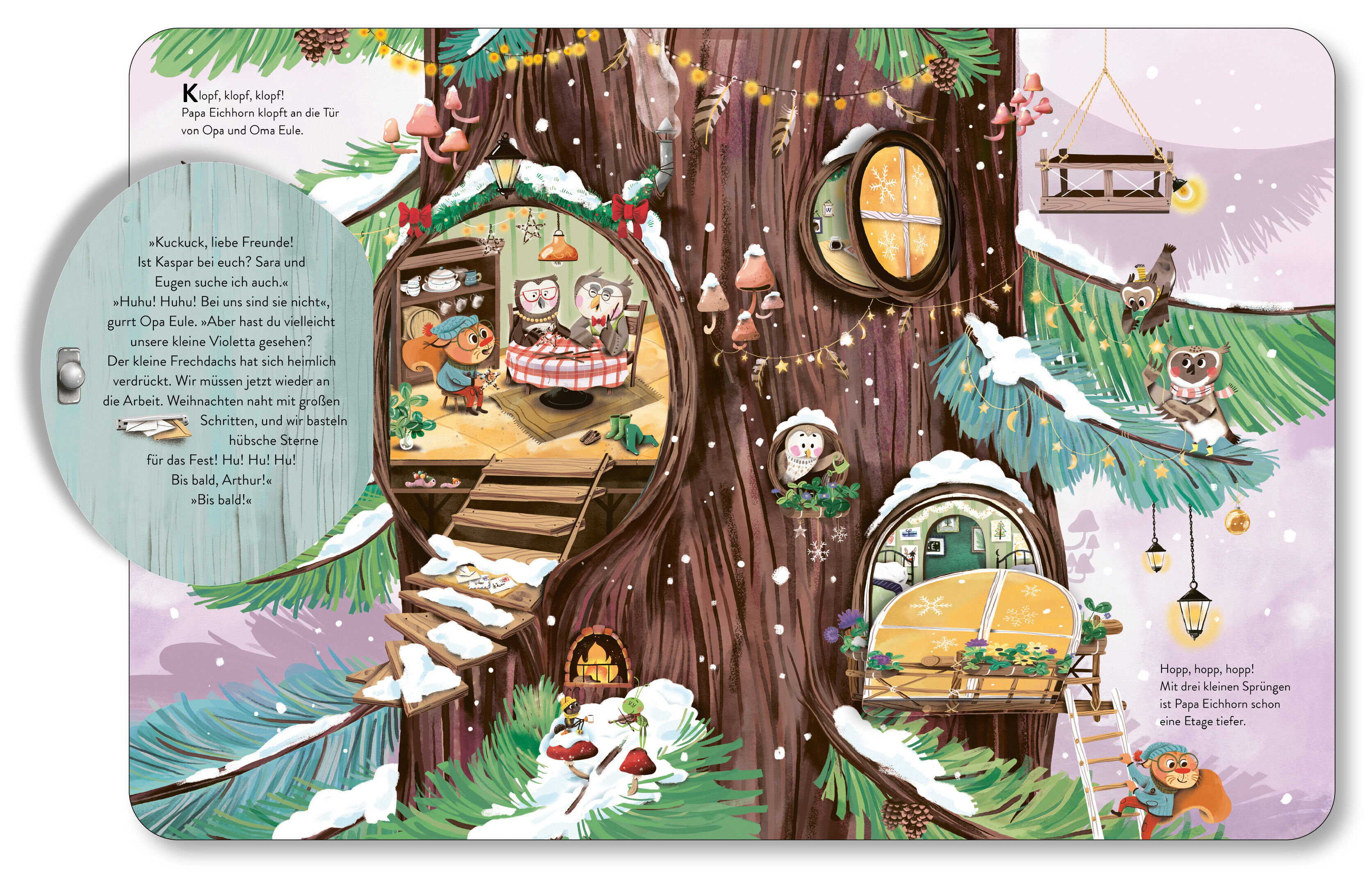 Weihnachtsvorbereitungen mit Eichhörnchen, Kaninchen, Eule und Co. Die kleinen Bewohner der großen Tanne sind mitten in den Vorbereitungen für das Fest. Aber wo steckt das kleine Eichhörnchen Kaspar? Papa Eichhorn macht sich auf die Suche, von der Tannenspitz...