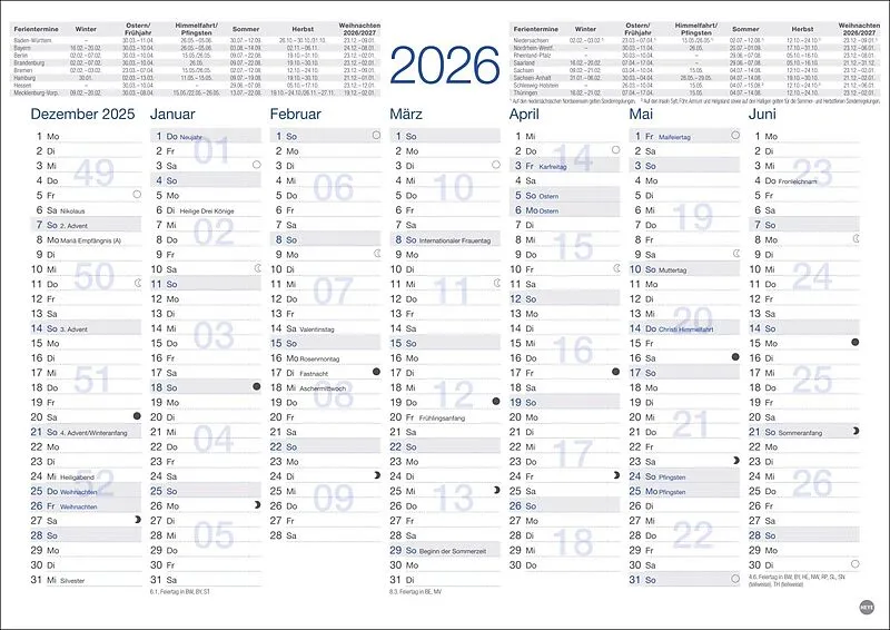- Für den schnellen Überblick: Kalender 2026 mit Schulferien und genügend Platz für Eintragungen - Büro-Organisation, Meetings und Co: Mit dem Kalenderposter 2026 im handlichen A4-Format sind alle Termine fest im Blick - Volle Konzentration auf das Wesentliche...
