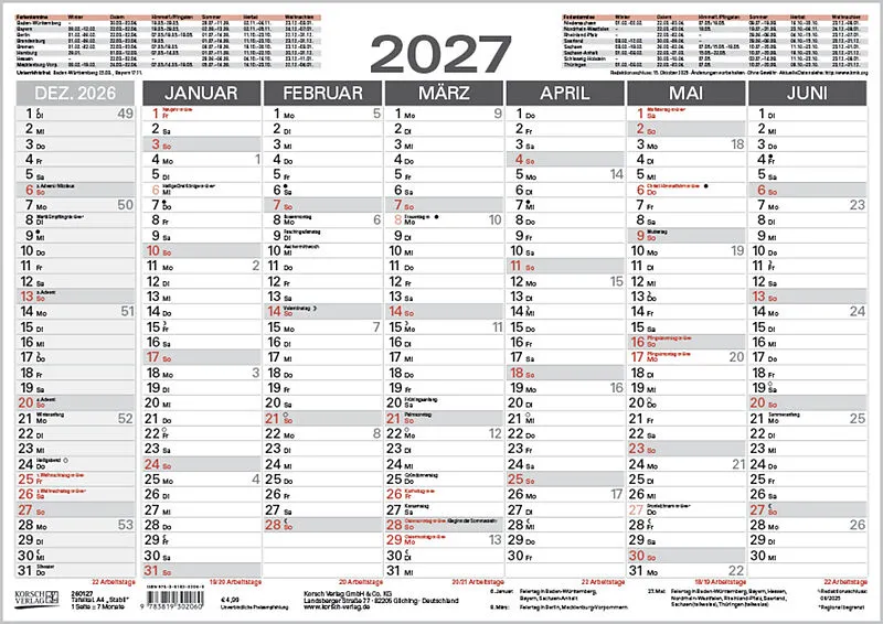 Produktmerkmale • praktisches A4-Format • Kalendarium auf Deutsch mit hervorgehobenen Sonn- und Feiertagen für D, A und CH • Gedruckt auf stabilem umweltfreundlichen FSC Papier Praktische Jahresplanung im handlichen A4-Format auf einem starken,...