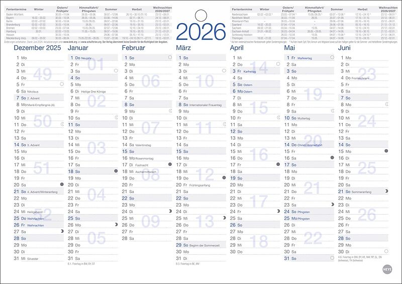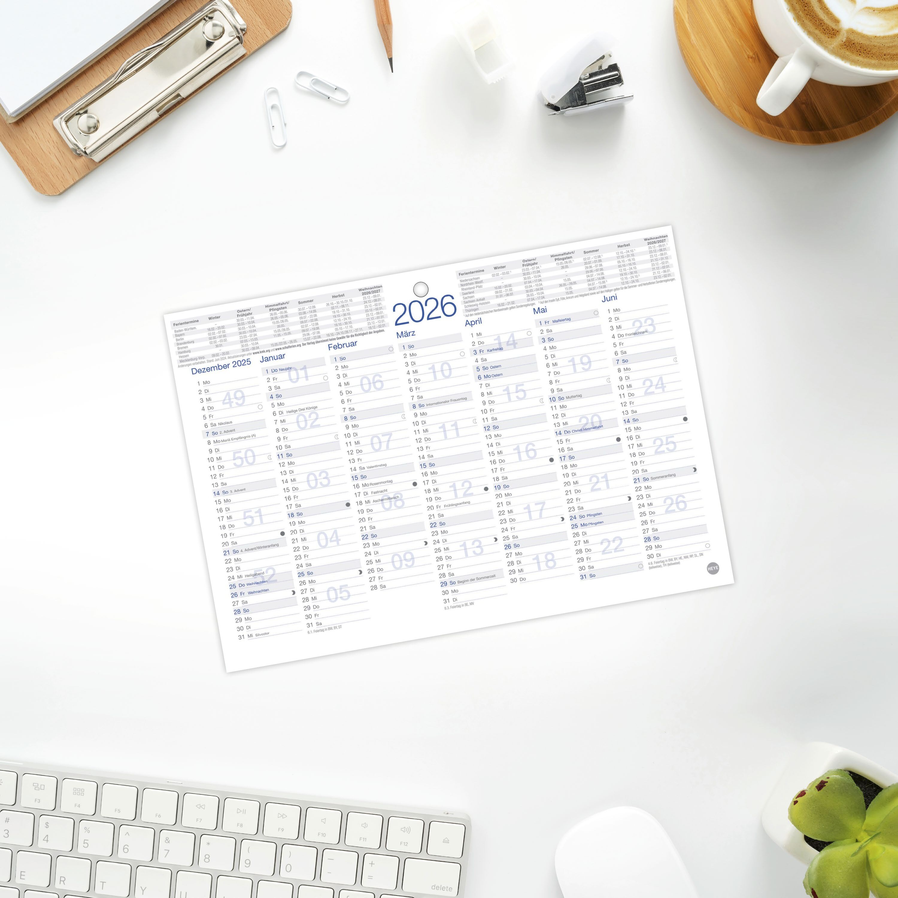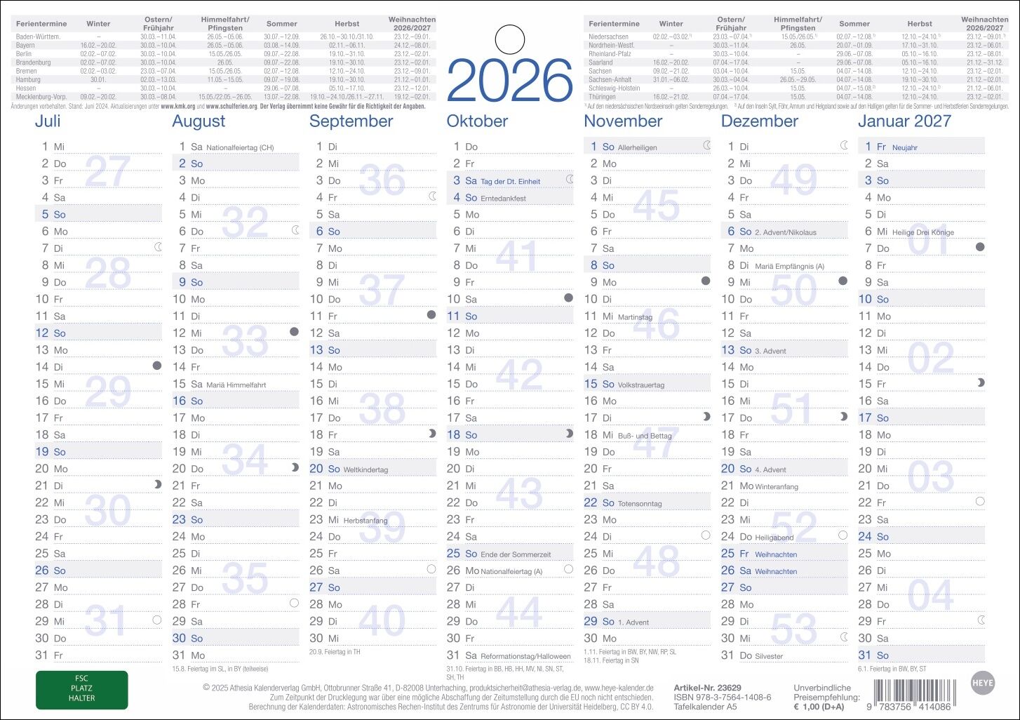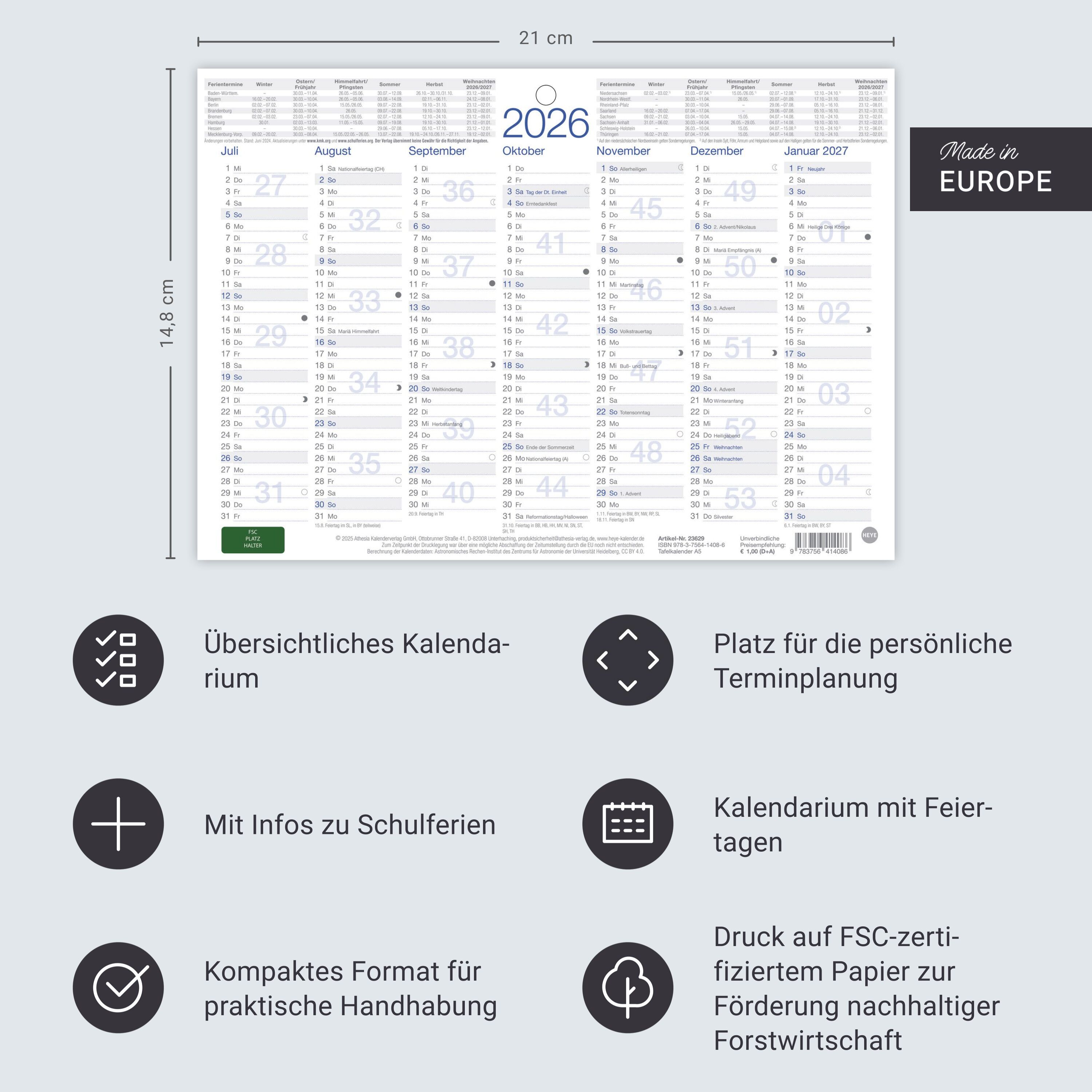 Minimalistisches Design maximaler Überblick: Der Tafelkalender 2026 im DIN A5-Format - Volle Konzentration auf das Wesentliche: Neutraler Kalender mit je sieben Monaten auf Vorder- und Rückseite und Angabe der Kalenderwochen - Wandplaner mit Schulferien-Über...