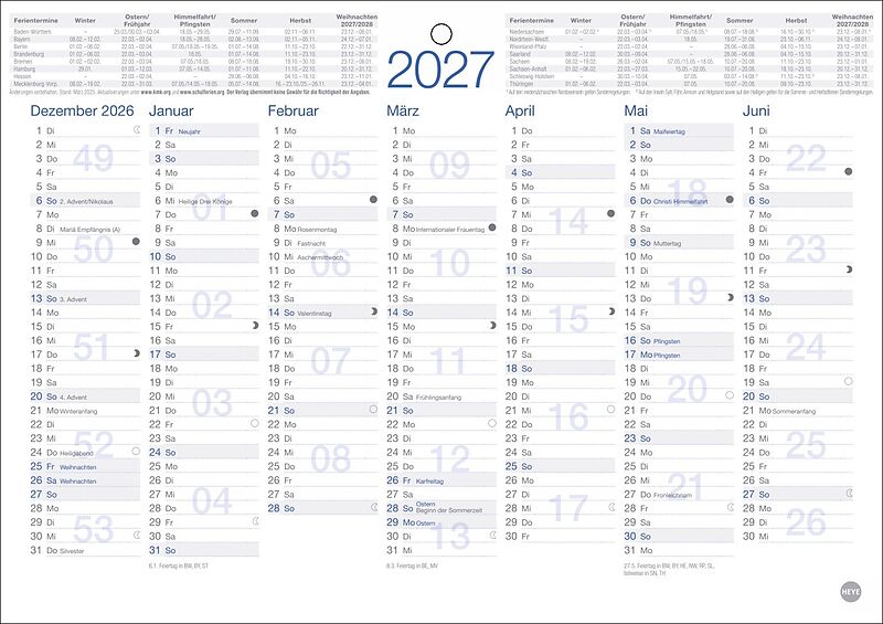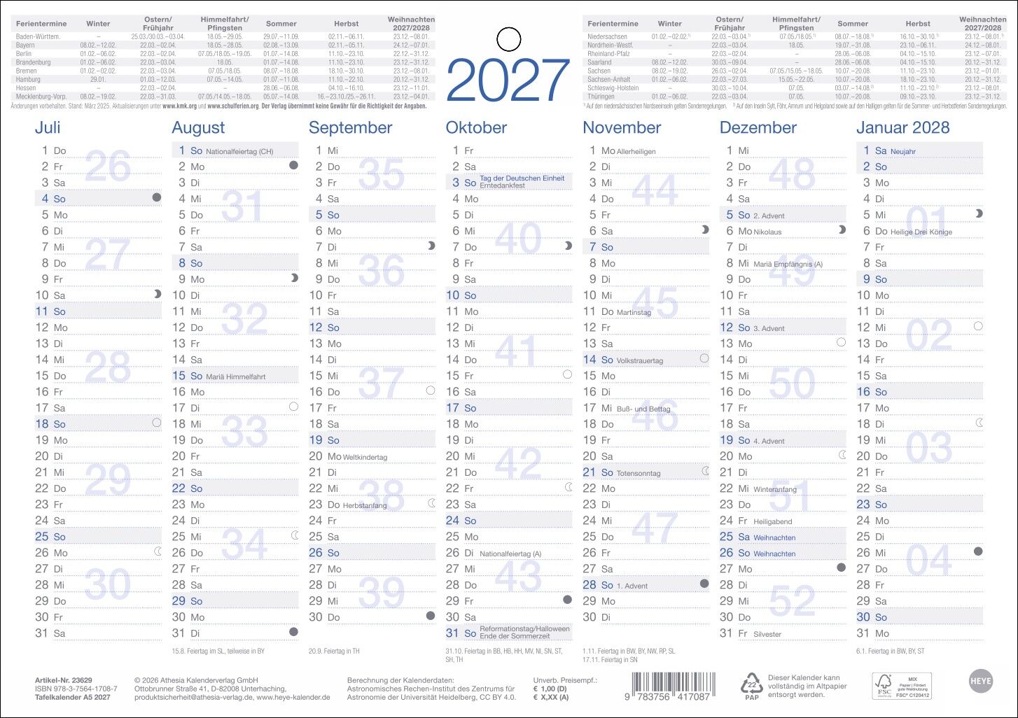 Minimalistisches Design maximaler Überblick: Der Tafelkalender 2027 im DIN A5-Format - Volle Konzentration auf das Wesentliche: Neutraler Kalender mit je sieben Monaten auf Vorder- und Rückseite und Angabe der Kalenderwochen - Wandplaner mit Schulferien-Über...