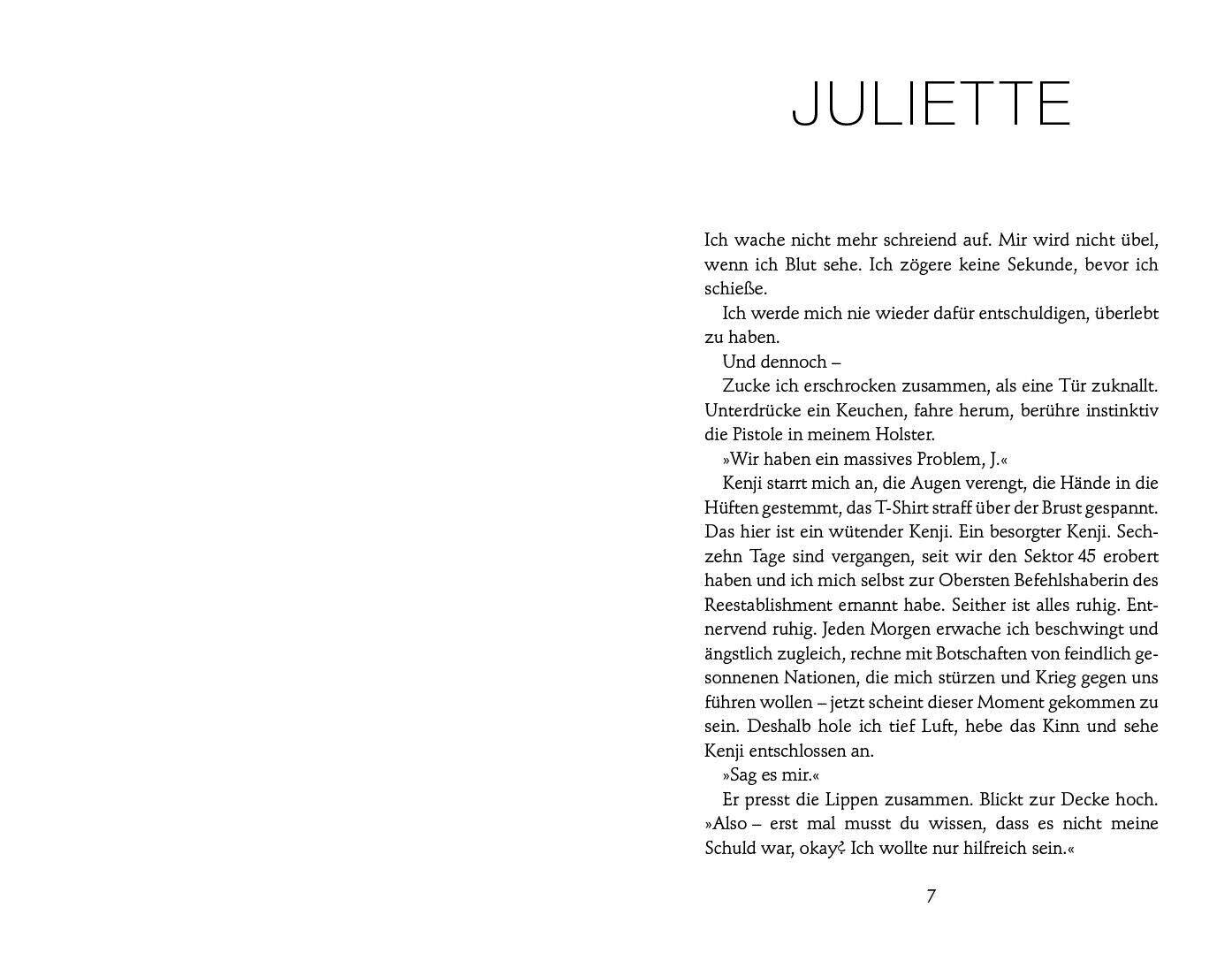 Das Mädchen, das mit nur einer Berührung töten kann, hält nun die Welt in ihrer Hand. Juliette Ferrars dachte, sie hätte gewonnen. Sie hat die Macht in Sektor 45 übernommen und ist zur Obersten Befehlshaberin ernannt worden und all das mit Warner an ihrer Seit...