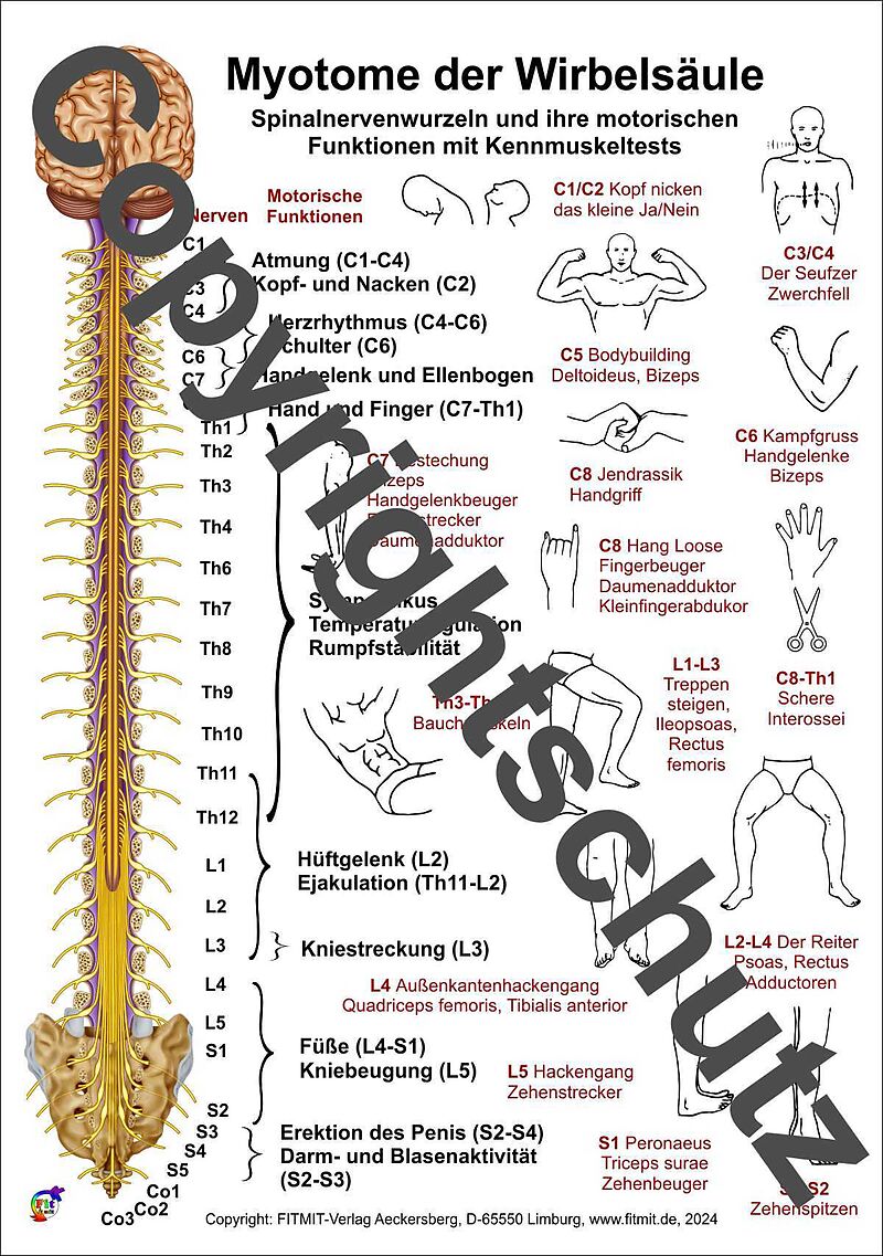 Myotome der Wirbelsäule - Spinalnervenwurzeln und ihre motorischen Funktionen mit Kennmuskeltests Lehrkarte. n der Anatomie versteht man unter einem Myotom die Muskulatur, die von einem Spinalnerven (Rückenmarksnerv) innerviert (versorgt) wird. Damit ist es di...