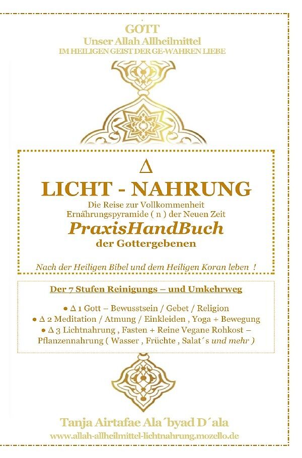 www.allah-allheilmittel-lichtnahrung.mozello.de Verbinde Dich In Gott mit dem 7 Himmlischen Stufen Pfad ! Reinige Dich , Wach Auf und Praktiziere 24 für ein Andauernd Höheres Bewusstsein ! 24 H - GOTT IM ALLTAG LEBEN . Fasten + Beten + Arbeiten Die 7 Stufen de...