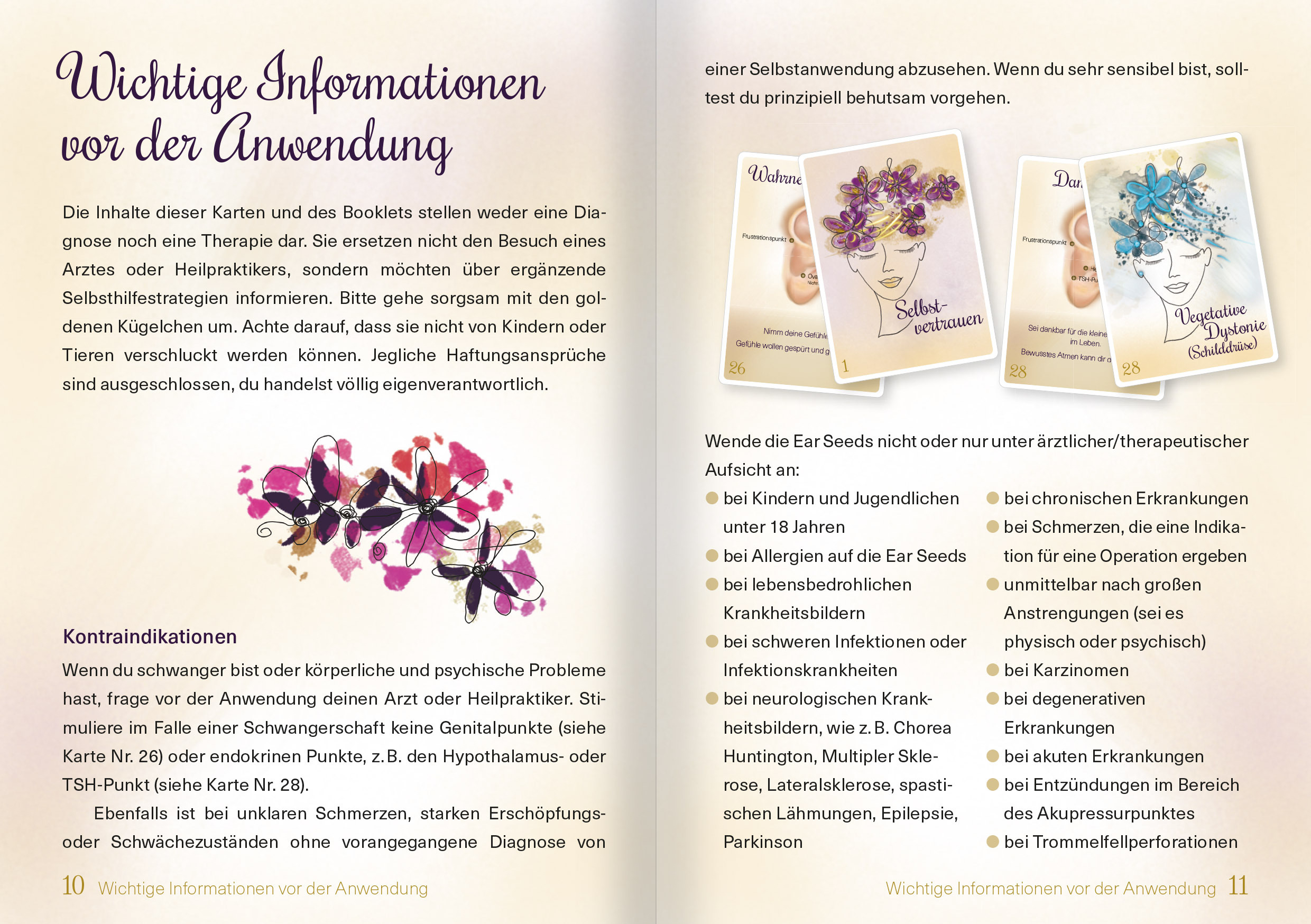 Ear Seeds - der ästhetische Gesundheitstrend Vergoldete Ear Seeds sind die sanfte und schicke Variante der Ohrakupressur. In den USA erfreuen sie sich bereits seit Jahren großer Beliebtheit und sind bis in die prominenten Kreise Hollywoods vorgedrungen. Die Oh...Ear Seeds - der ästhetische Gesundheitstrend Vergoldete Ear Seeds sind die sanfte und schicke Variante der Ohrakupressur. In den USA erfreuen sie sich bereits seit Jahren großer Beliebtheit und sind bis in die prominenten Kreise Hollywoods vorgedrungen. Die Ohrkügelchen passen als kleine Hausapotheke in jede Handtasche, können dank des durchsichtigen Heftpflasters ganz einfach aufgeklebt werden und sehen dazu noch sehr gut aus! Die Anwendung von "Ohrsamen" - in ursprünglicher Form mit Samenkörnern der Vaccaria-Pflanze - stammt aus der Traditionellen Chinesischen Medizin und hat sich u.a. bei Kopfschmerzen, Rückenbeschwerden, Schlafstörungen, hormonellen Dysbalancen, Ängsten und Allergien bewährt. Zudem kräftigt das Edelmetall Gold nach Lehre der TCM die Lebensenergie Qi. Die vergoldeten Ear Seeds werden auf bekannte Ohrakupunkturpunkte geklebt und können dort ihre sanft stimulierende (Druckreiz-)Wirkung entfalten. Die Karten zeigen in liebevollen Illustrationen die genaue Position der Energiepunkte, nennen Einsatzgebiet und Thema, vermitteln wegweisende Botschaften und schenken heilsame Impulse. Dabei können die gerade benötigten Karten/Punkte gezielt mithilfe des Symptomregisters ausgewählt oder aber intuitiv gezogen werden. - 36 Karten im A6-Format mit farbigen Illustrationen von Tanja Anna Maria Parvin: Einsatzgebiet/Symptom, Thema, Lage der Punkte und Botschaft - 24-seitiges Booklet mit ausführlicher Anleitung und Symptomregister - 20 hochwertige, vergoldete Ear Seeds (Ø 1,2 mm) auf rundem transparentem Hautpflaster (Ø 7 mm, latexfreier Acrylharzkleber)