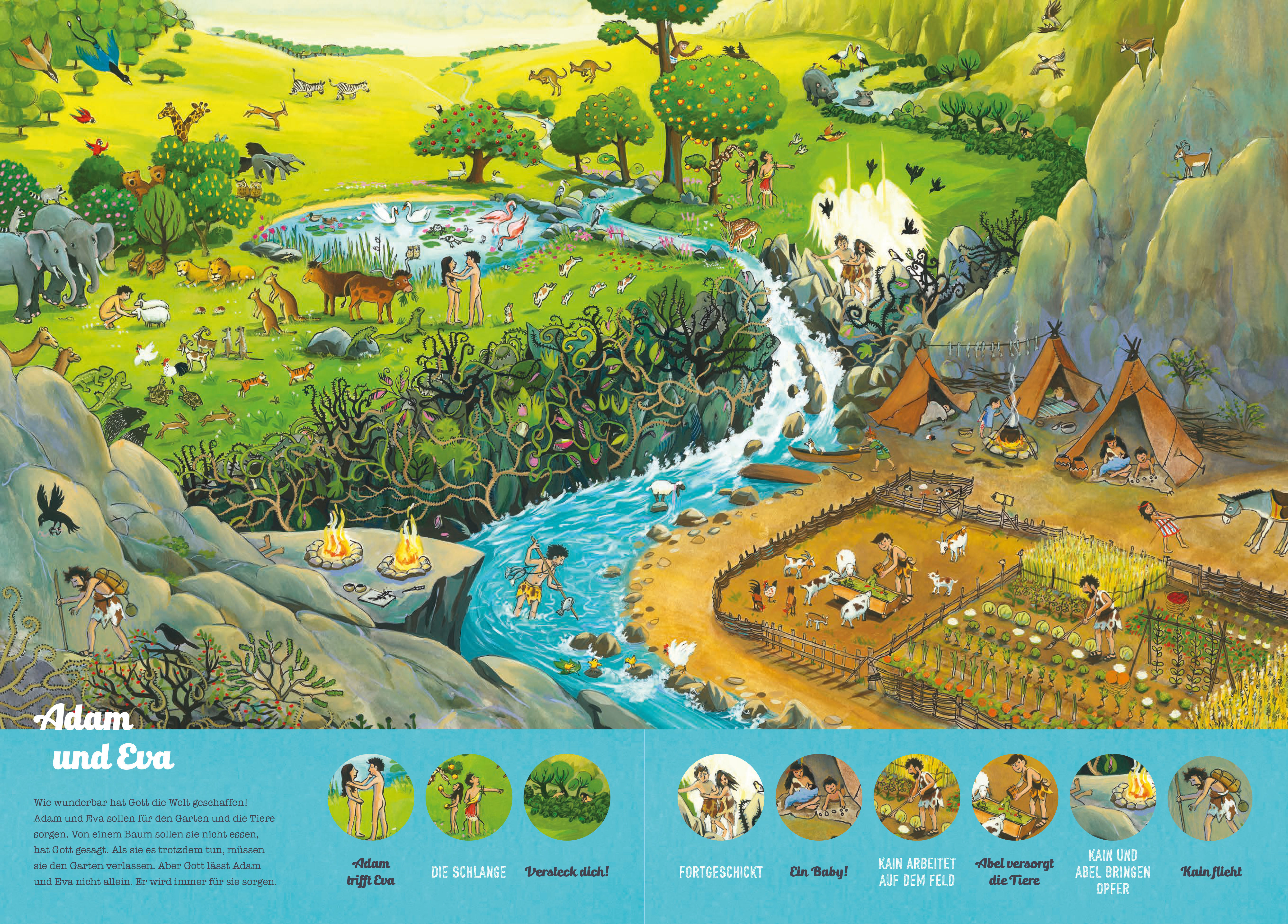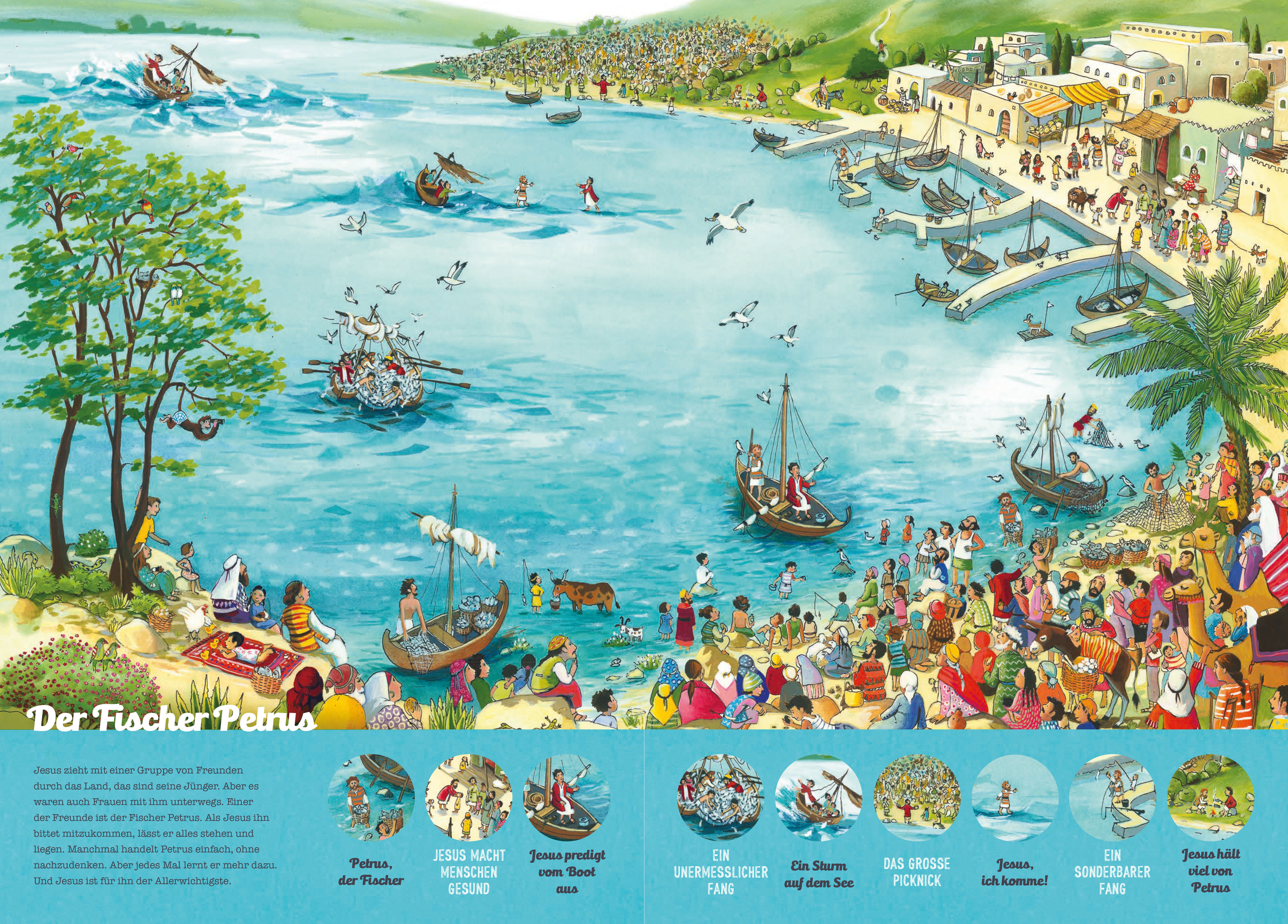Wer entdeckt Josef und seine Brüder? Biblische Figuren suchen und ihre Geschichten erfahren Ob David im Duell mit dem Riesen oder Jesus auf dem Weg nach Jerusalem: Kinder finden auf den großformatigen Wimmelbildern immer wieder neue Details. Auf acht Doppelse...