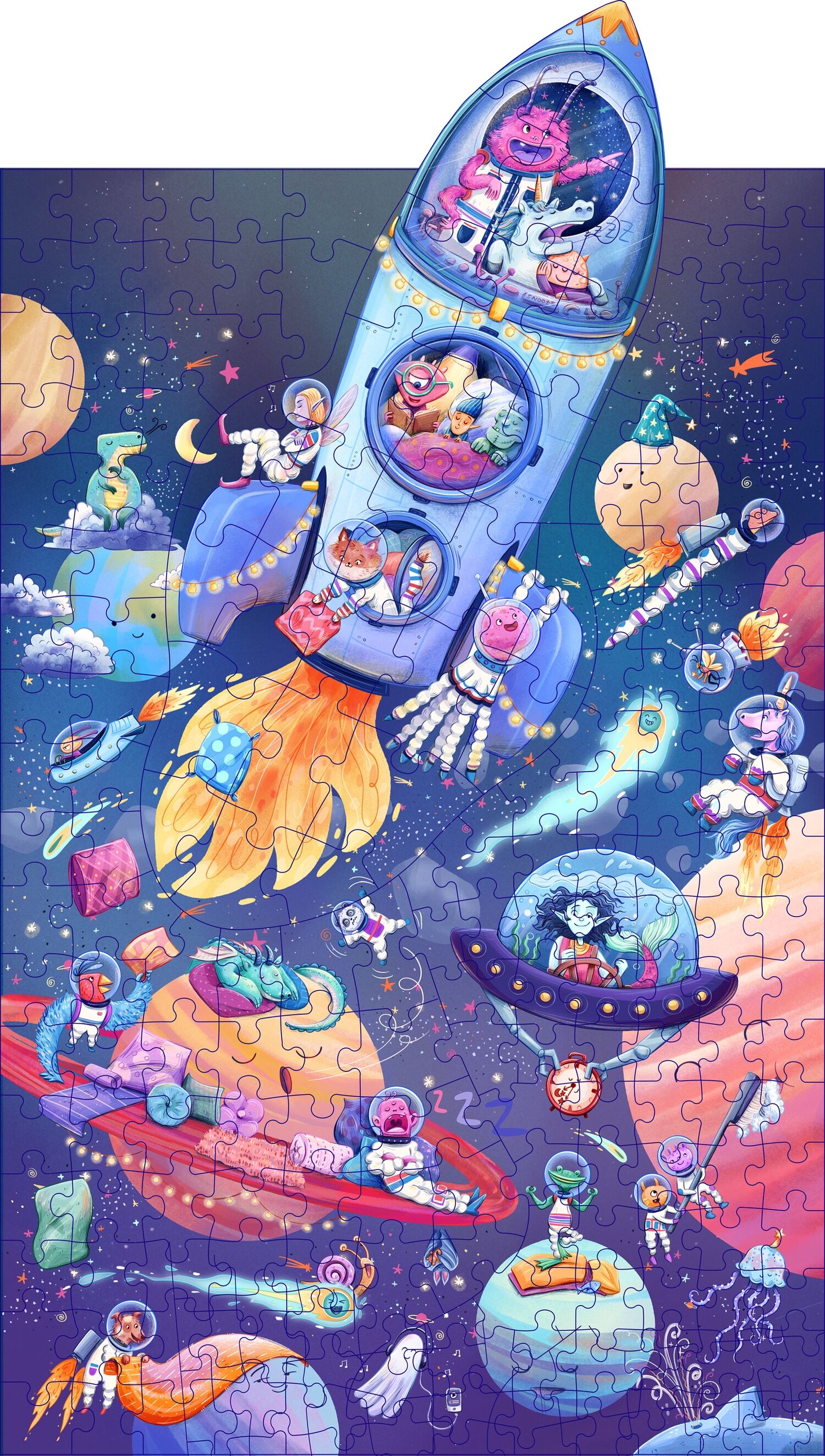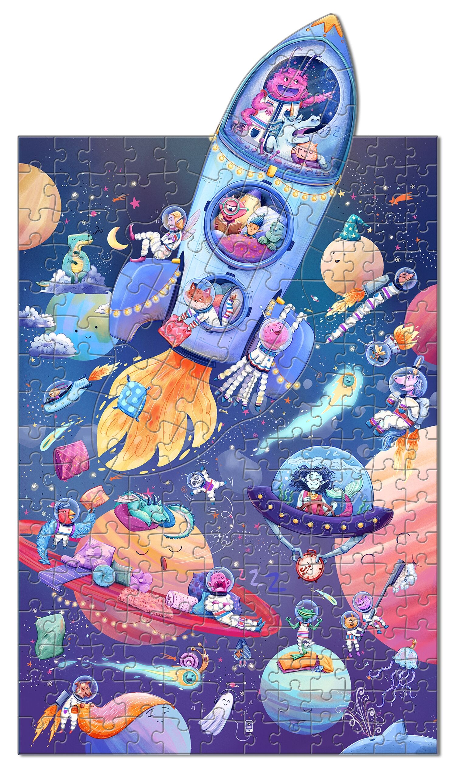 Kleine und große Puzzlefans aufgepasst: Hier können Kinder und Eltern gemeinsam puzzeln! Denn das Familien-Puzzle enthält 200 Teile in drei unterschiedlichen Größen: Kleine Hände schnappen sich die großen Teile und große Hände die kleineren. So entsteht Teil für Teil ein fantasievolles Weltraum-Motiv, auf dem es ganz schön wimmelig und witzig zugeht. Und das Beste: Die Rakete für die Kleinsten ist formgestanzt und lässt sich ganz einfach aus dem großen Motiv herauslösen! An die Puzzleteile, fertig, Familienzeit!