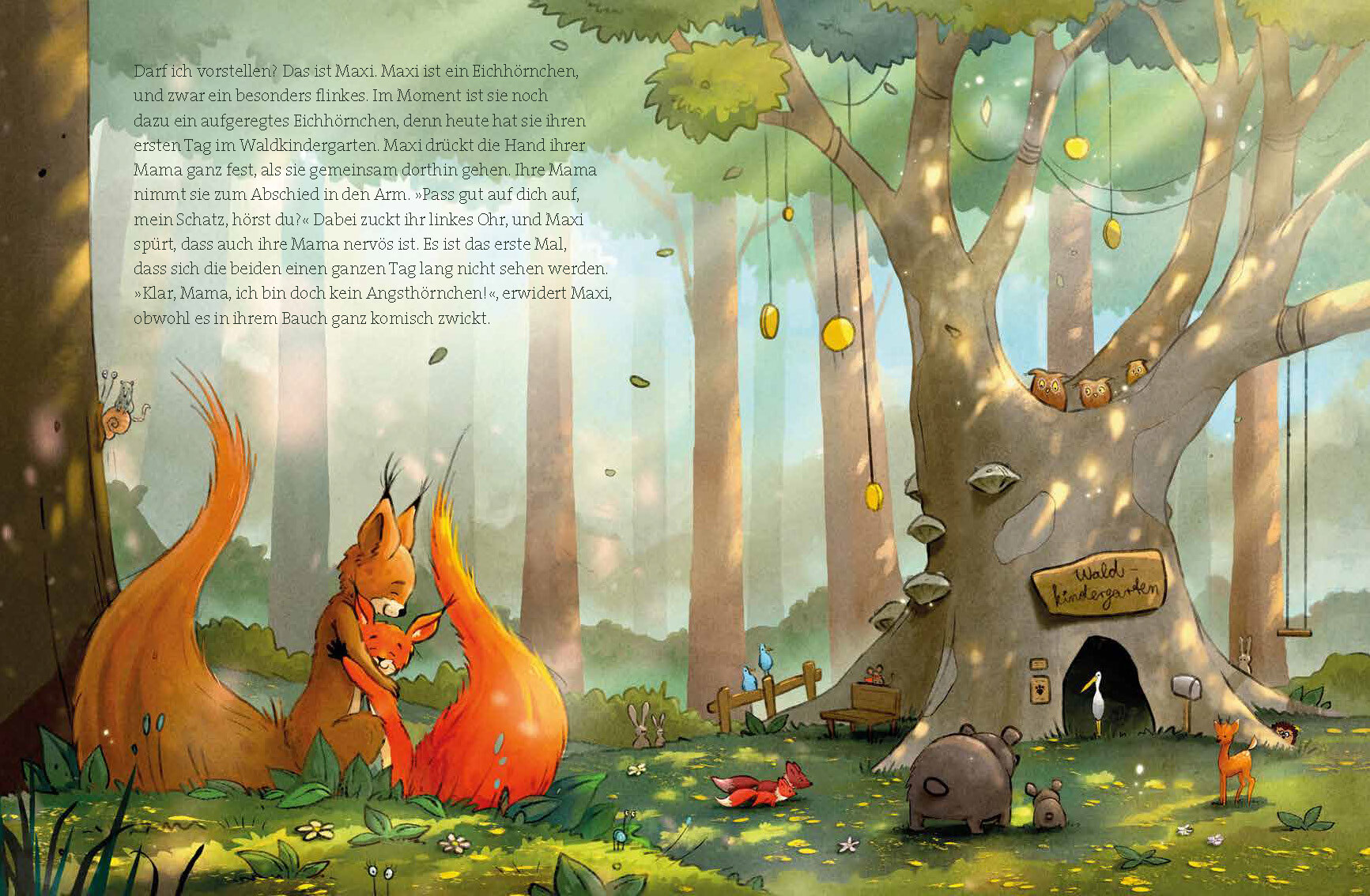 Eichhörnchen Maxi hat ihren ersten Tag im Waldkindergarten. Klar, dass das ganz schön aufregend ist! So aufregend, dass sogar die Eichhörnchen-Mama nervös ist. Sie hat ihre Tochter doch noch nie so lange allein gelassen und ermahnt sie beim Abschied, unbeding...