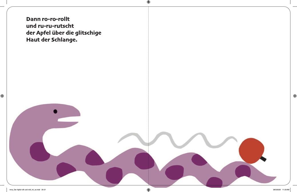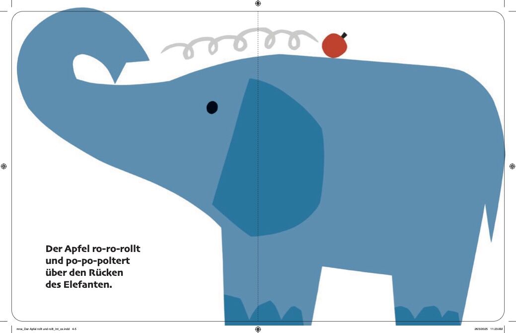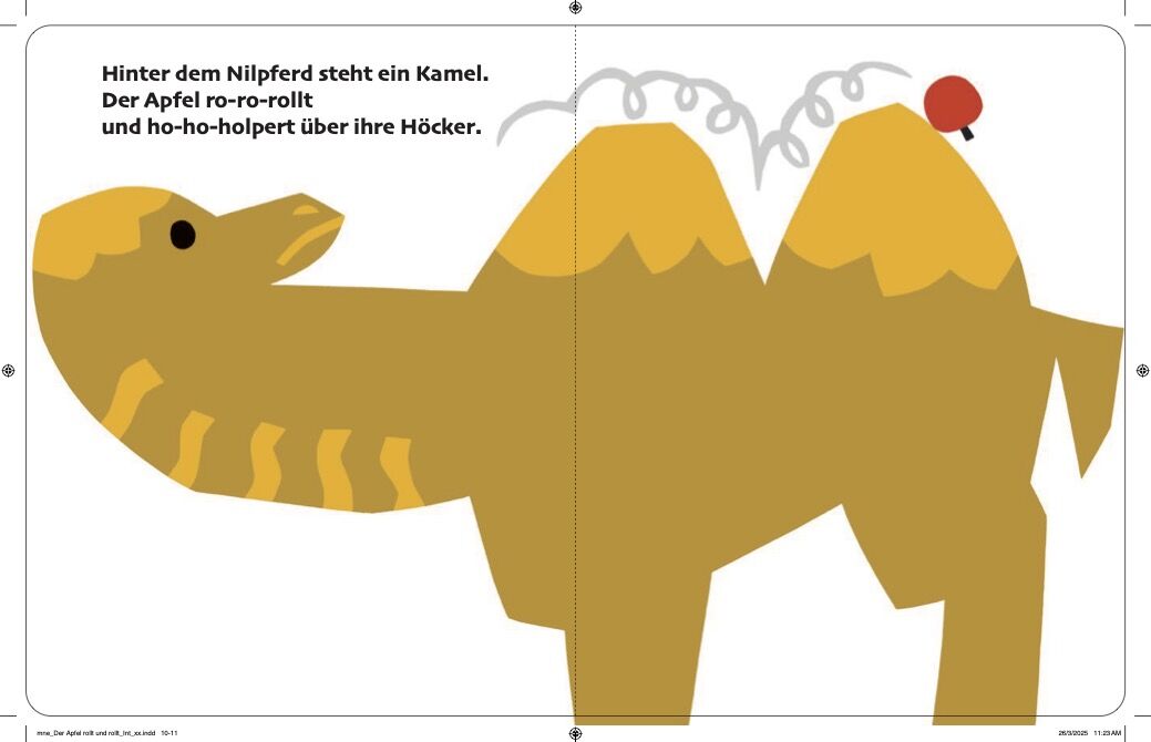 Der Elefant will den Apfel vom Baum pflücken, aber er fällt ihm vom Rüssel und kullert dann von Tier zu Tier. Zuerst rutscht er den Hals der Giraffe hinunter, landet dann auf den Höckern des Kamels, rollt über den Rücken des Nilpferds, des Krokodils, des Affen...