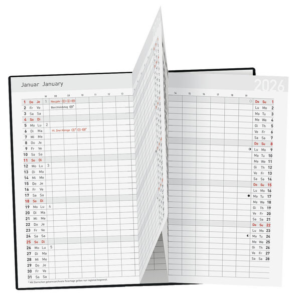 Produktmerkmale Taschenkalender im Format: 8,7 x 15,3 cm, 30 Seiten Jeder Monat übersichtlich auf einer gefalzten, ausklappbaren Doppelseite; Inklusive Uhrzeiten und Mondphasen Mehrsprachiges Kalendarium (D,GB,F,I) mit Feiertagen für Deutschland, Österreich u...