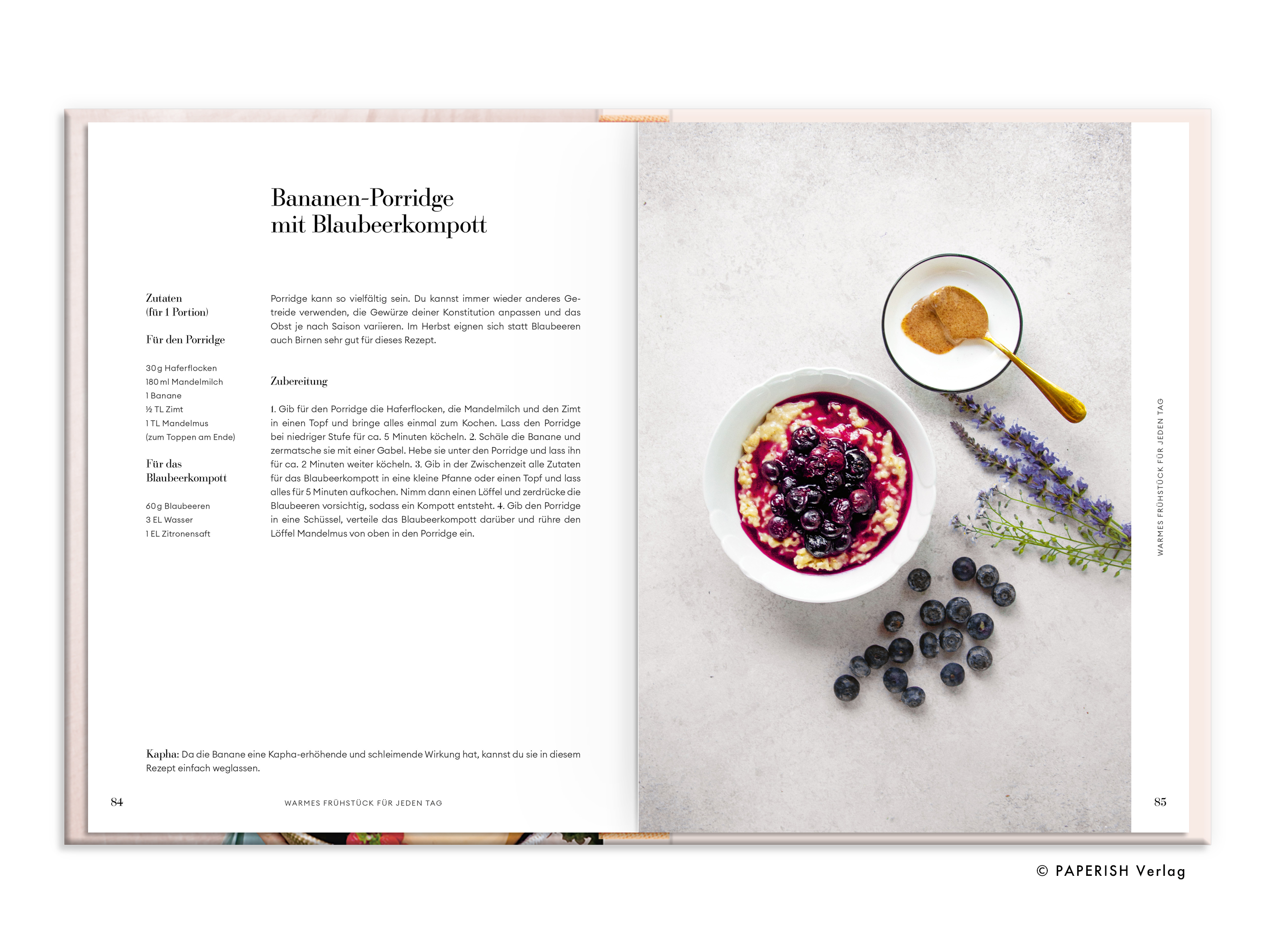 100 neue leckere und gesunde Rezepte stellt Katharina hier vor: alle vegan, glutenfrei, ohne industriellen Zucker und aus natürlichen Zutaten. Neben Klassikern des Ayurveda, wie dem Kitchari, finden sich hier auch praktische Basics von Gewürzmischungen, die auf den eigenen Ernährungs-Typ abgestimmt sind, bis hin zu immunstärkenden Ingwer-Shots. Ganz neu zu entdecken sind die Lieblingsrezepte aus der internationalen Küche, die Katharina ayurvedisch und vegan kreiert hat: ob Zwischenmahlzeiten wie Bruschetta und Hummus oder Comfort Food wie Lasagne und Gnocchi. Und weil ein guter Tag mit dem Frühstück beginnt, gibt es eine Vielzahl leckerer Frühstücks- und Brunch-Rezepte, bis hin zur Hafermilch Barista-Version für den Cappuccino, den man zu Muffins und Schokoaufstrich genießen kann.
