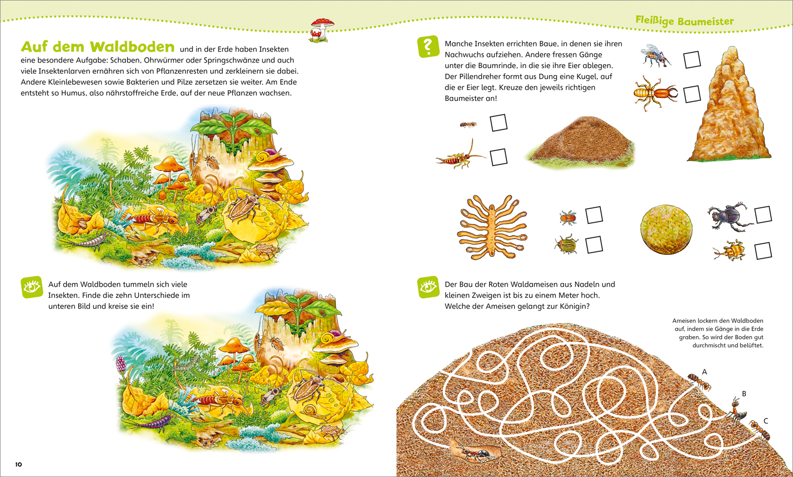 Insekten, obwohl winzig klein, machen die größte Tiergruppe der Erde aus. Kleine Naturforscher ab 4 Jahren erobern diese spannende Welt anhand von zahlreichen Rätseln wie Suchbildern oder Labyrinthen und Ausmalmotiven. Wie gelangt die Ameise durch den Irrgarte...