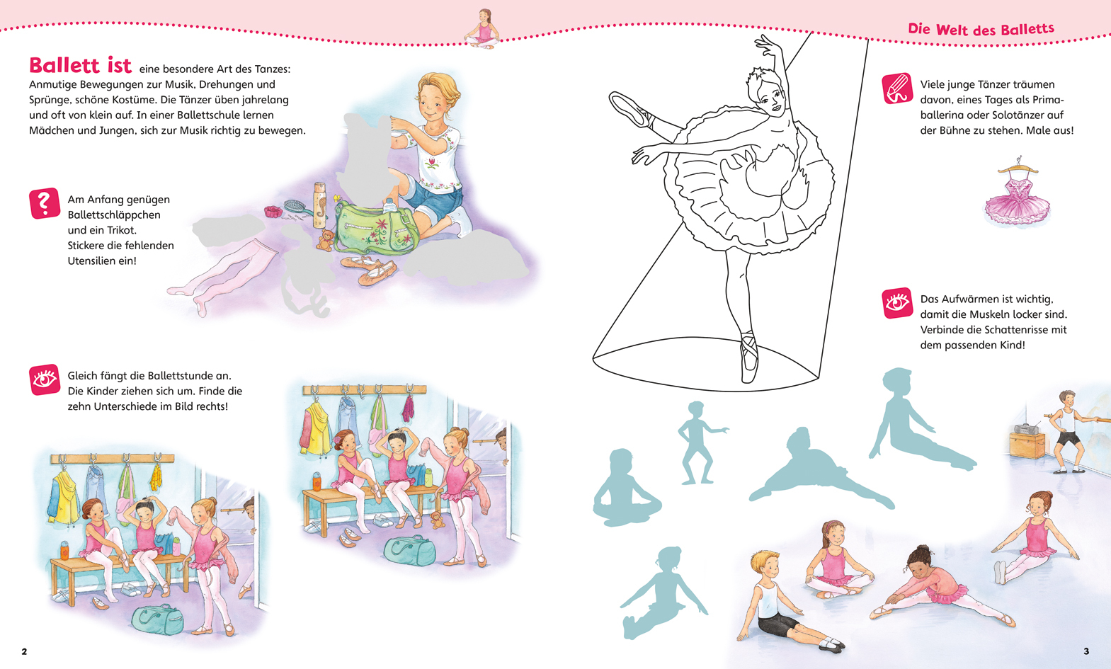Wie bindet man Spitzenschuhe richtig? Welche Fußstellung gehört zu welcher Grundposition? Und in welchen Farben soll das Kostüm der Primaballerina erstrahlen? Ob während einer Ballettstunde oder hinter den Kulissen eines Opernhauses die spannenden Rätsel und d...