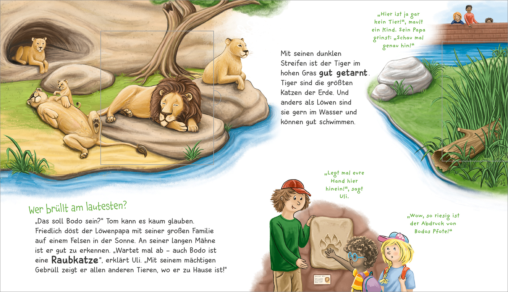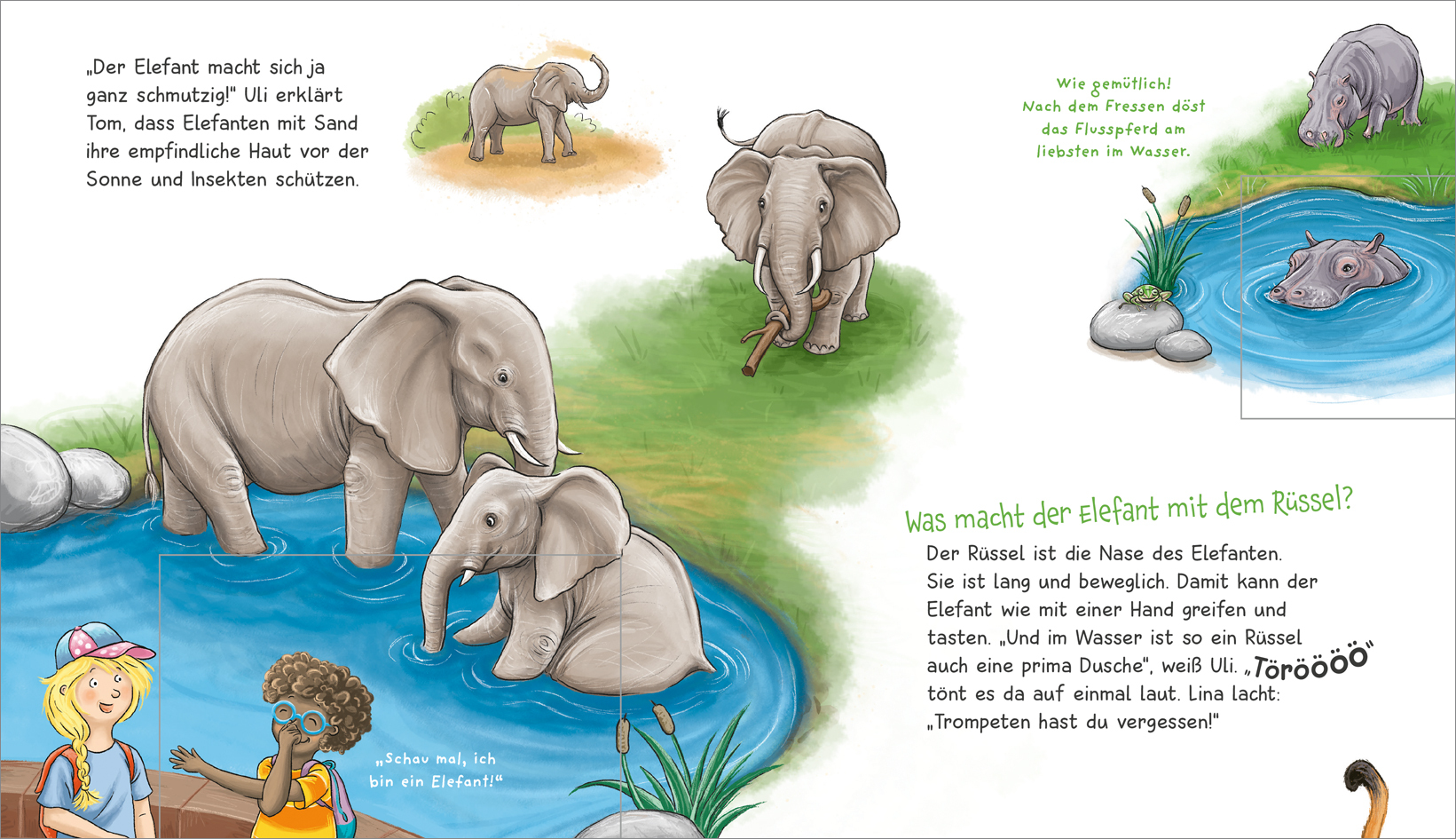 Was für ein Abenteuer! Die beiden Kindergartenkinder Lina und Tom sind mit Tierpfleger Uli im Zoo unterwegs. Dort treffen sie auf eine freche Giraffe, die an Linas Hut knabbert, dürfen das neugeborene Tapir-Baby besuchen und bekommen etwas von der Elefantendus...