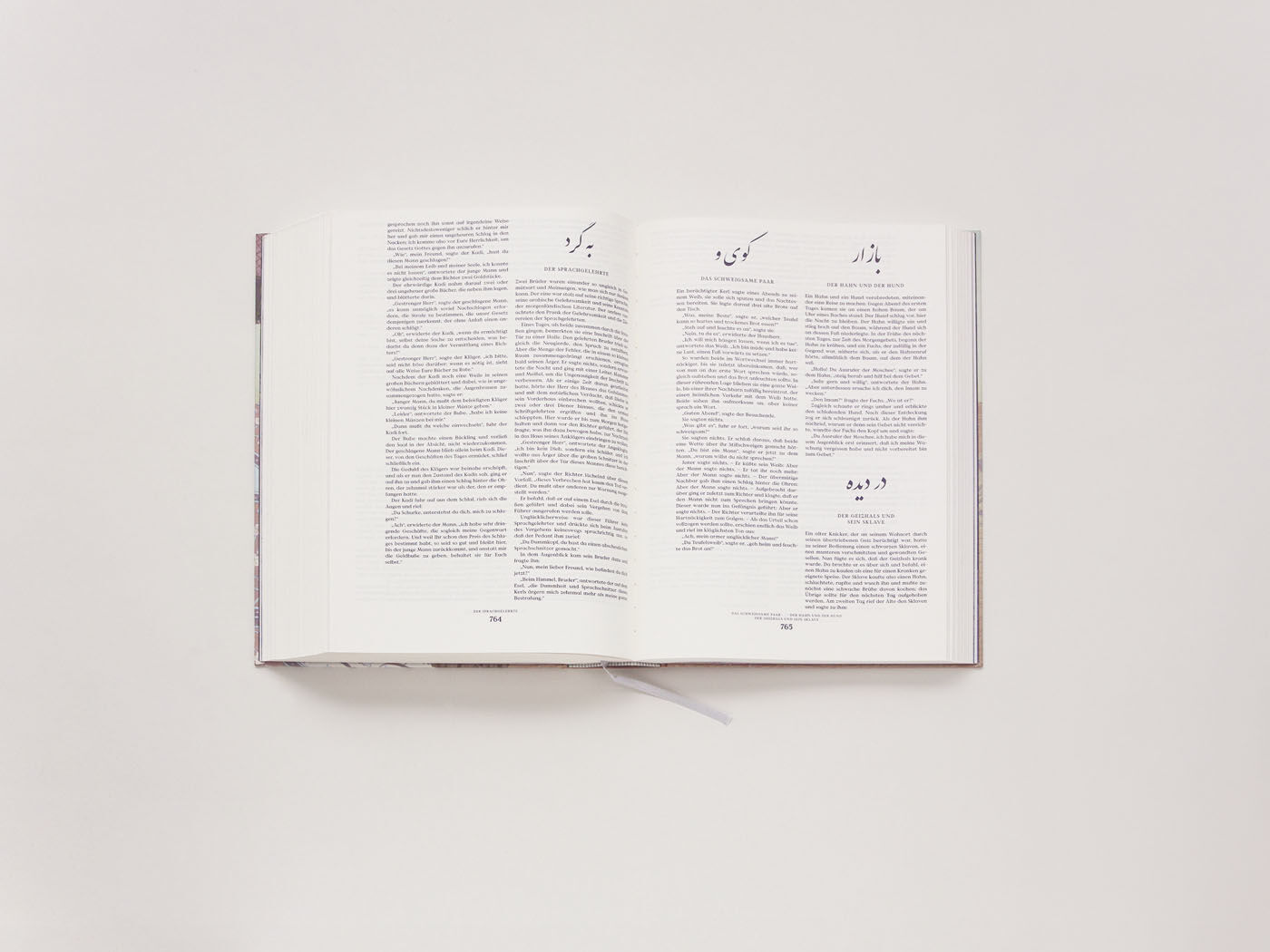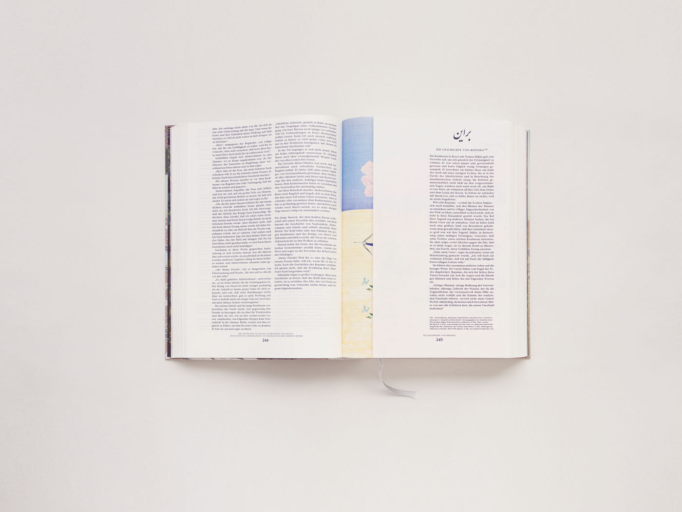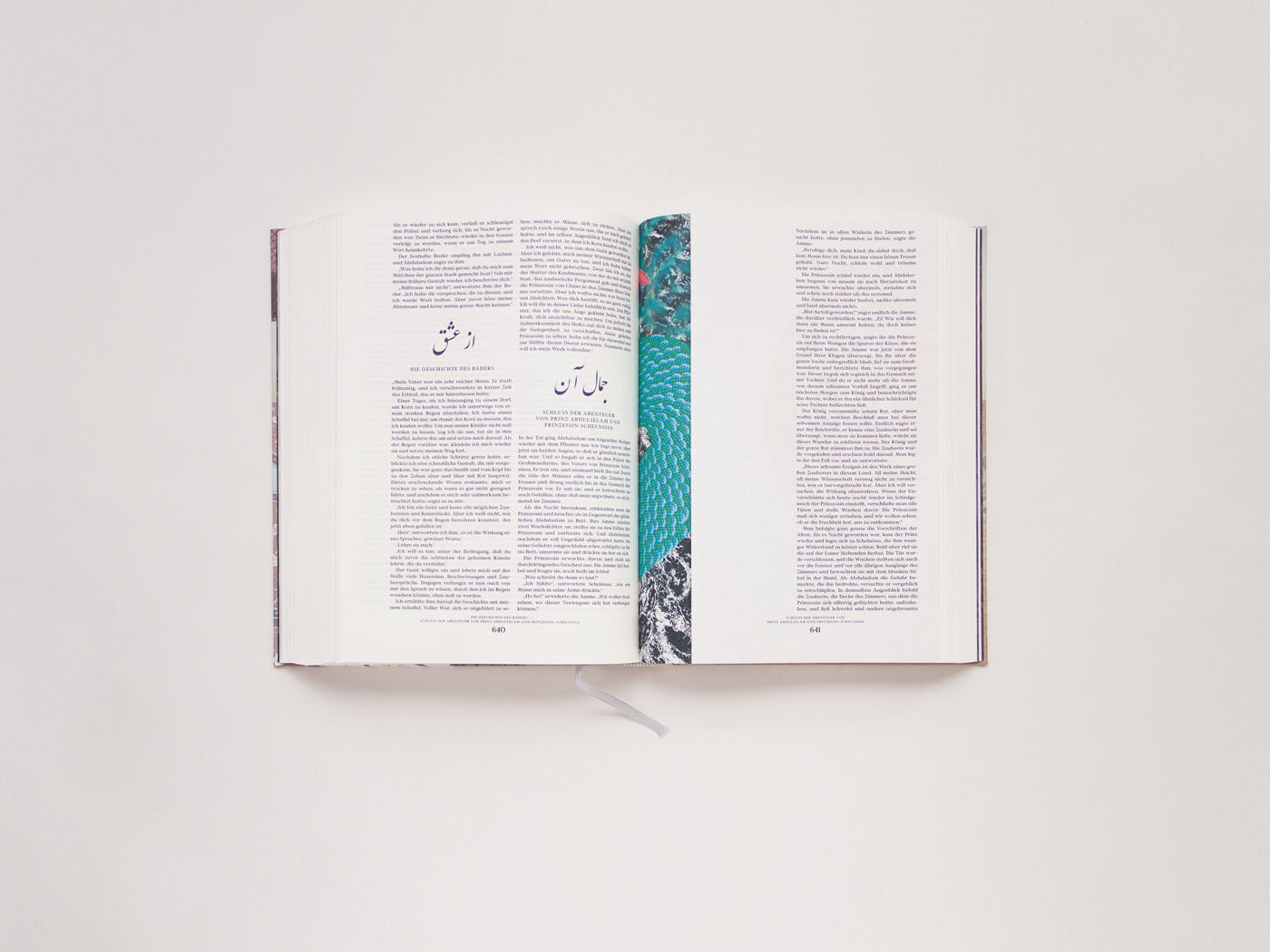 Opulent bebildert mit einem aufklappbaren und das ganze Werk durchziehenden Bildfries, collagiert aus einem Fundus von alten persischen, indischen und arabischen Abbildungen aus privaten und öffentlichen Sammlungen und Archiven, ersteht vor unseren Augen die unendliche Farben- und Formenvielfalt des Orients.