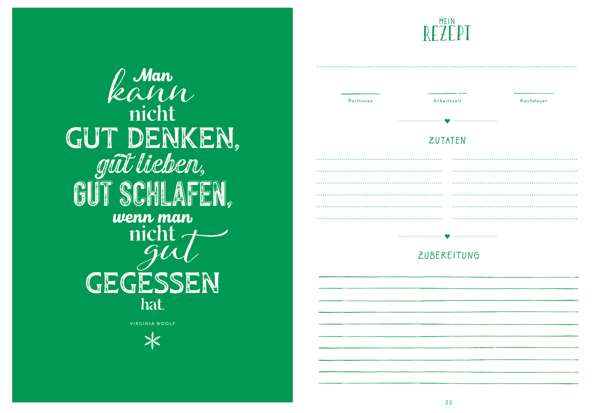 Liebevoll gestaltetes DIY-Einschreibheft mit kulinarischen Zitaten. Mit separater Zutatenliste und Inhaltsverzeichnis zum Selbstgestalten.