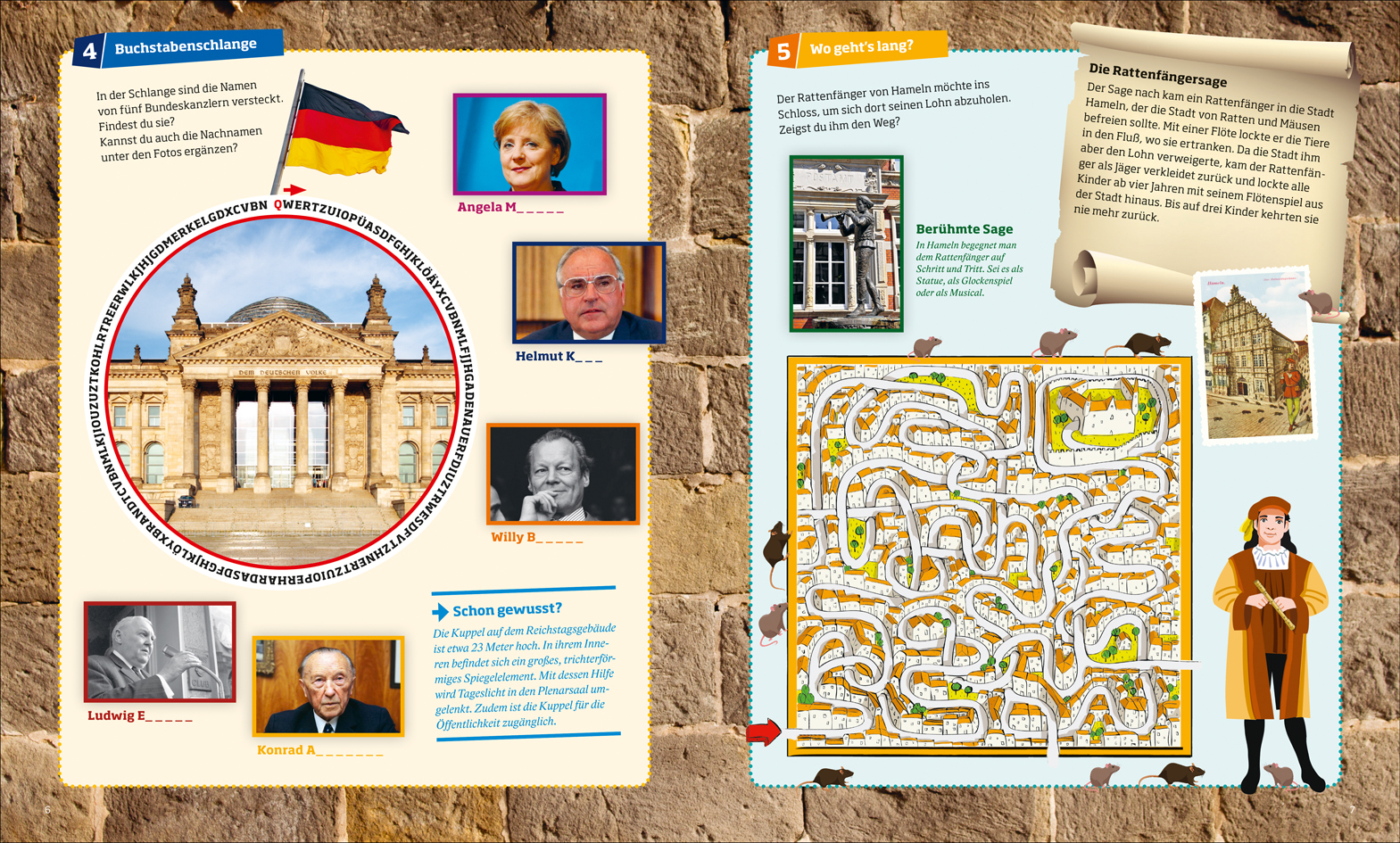Welche Flüsse verbergen sich im Silbenrätsel? Wer hilft dem Rattenfänger von Hameln den Weg durchs Labyrinth zu finden? Buchstaben- und Logikrätsel, Labyrinthe und Quizfragen: Die WAS IST WAS Rätsel- und Stickerhefte bieten neben unterhaltsamen Aufgaben auch s...
