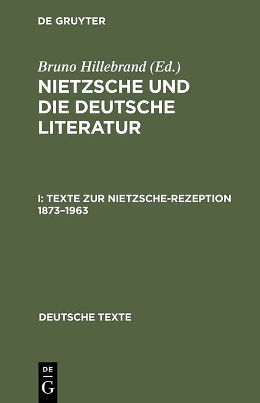 Frontmatter -- Inhaltsverzeichnis -- Vorwort / Hillebrand, Bruno -- Einführung / Hillebrand, Bruno -- 1. Brief an Emil Kuh vom 18. 11. 1873 / Keller, Gottfried -- 2. Brief an Nietzsche vom 4. 1. 1877 / Hart, Heinrich -- 3. Nietzsches gefährliches Buch (1886) / Widmann, Josef Victor -- 4. Triumpf des Uebermenschen (1887) / Conradi, Hermann -- 5. Friedrich Nietzsche (1889) / Berg, Leo -- 6. Brief an M. G. Conrad vom 15. 4. 1889 / Liliencron, Detlev von -- 7. Friedrich Nietzsche (1890) / Ernst, Paul -- 8. Am Ausgang des neunzehnten Jahrhunderts (1890) / Hart, Heinrich -- 9. Tagebuch (1890) / Hartleben, Otto Erich -- 10. Brief an Karl Henckell vom 27. 5. 1890 / Liliencron, Detlev von -- 11. Prüderie (1890) / Schlaf, Johannes -- 12. Zum Bilde Friedrich Nietzsches (1891) / Andreas-Salomé, Lou -- 13. An Friedrich Nietzsche (1891) / Dehmel, Richard -- 14. Der Kultus der Persönlichkeit (1891) / Grottewitz, Curt -- 15. Brief an Arthur Schnitzler vom 13. 7. 1891 / Hofmannsthal, Hugo von -- 16. Entwurfsblätter zu »Der Tod des Tizian« (1891) / Hofmannsthal, Hugo von -- 17. Religiöse Erziehung (1891) / Landauer, Gustav -- 18. Bekehrungsgeschichte (1891) / Mann, Heinrich -- 19. Brief an Hugo von Hofmannsthal vom 27. 7. 1891 / Schnitzler, Arthur -- 20. Ein Typus (1892) / Hart, Heinrich -- 21. Notizen in »Zur Genealogie der Moral«, 2. Aufl., Leipzig 1892 (1892ff.) / Hofmannsthal, Hugo von -- 22. Zur Psychologie des Individuums (1892 ) / Przybyszewski, Stanislaw -- 23. Nietzsche und der Sozialismus (1892) / Servaes, Franz -- 24. Die Philosophie des reinen Mittels (1892) / Wille, Bruno -- 25. Die Gefahren der Nietzscheschen Philosophie (1893 ) / Bölsche, Wilhelm -- 26. Notizen zu »Der Wille zur Macht« (1893) / Hofmannsthal, Hugo von -- 27. Brief an Josef Viktor Widmann vom 23. 9. 1893 / Huch, Ricarda -- 28. Der Todesprediger (1893) / Landauer, Gustav -- 29. Maurice Barrès (1894) / Bahr, Hermann -- 30. Das Geheimnis Friedrich Nietzsches (1894) / Bölsche, Wilhelm -- 31. Jugend! (189j) / Conrad, Michael Georg -- 32. Der Übermensch in der Politik (1895) / Conrad, Michael Georg -- 33. Liebe Freunde! (1895) / Dehmel, Richard -- 34. Zur modernen Dichtung (1895) / Flaischlen, Caesar -- 35. Brief an Otto Neumann-Hofer vom 1. 3. 1895 / Fontane, Theodor -- 36. Brief an die Mutter Friedrich Nietzsches vom 6. 5. 1895 / Morgenstern, Christian -- 37. Über Kraft (1896) / George, Stefan -- 38. Vorrede zur III. Folge der Blätter für die Kunst (1896) / George, Stefan -- 39. Notizen zu »Die Geburt der Tragödie aus dem Geiste der Musik« (ca. 1896) / Hofmannsthal, Hugo von -- 40. Sozialaristokraten (1896) / Holz, Arno -- 41. Zum Verständnisse Nietzsches (1896) / Mann, Heinrich -- 42. Nietzsche, der Erzieher (1896) / Morgenstern, Christian -- 43. Nietzsche (1896/1912) / Morgenstern, Christian -- 44. Byron der Uebermensch (1897) / Bleibtreu, Karl -- 45. Nietzsche's Herrenmoral und die Naturwissenschaft (1897) / Grottewitz, Curt -- 46. Die versunkene Glocke und der falsche Nietzsche (1897) / Lublinski, Samuel -- 47. Brief an Otto Julius Bierbaum vom 29. 1 1 . 1897 / Morgenstern, Christian -- 48. Tagebuchnotizen zu »Also sprach Zarathustra« (1898) / Hofmannsthal, Hugo von -- 49. Der Kampf um Nietzsche (1899) / Conrad, Michael Georg -- 50. Zarathustra (1899) / Conrad, Michael Georg -- 51. Der neue Gott (1899) / Hart, Julius -- 52. Evolution der Lyrik (1899/1918) / Holz, Arno -- 53. Mehr Goethe (1899) / Huch, Rudolf -- 54. Der neue Gott (1899) / Landauer, Gustav -- 55. Der Liberalismus und die moderne Litteratur (1899) / Lublinski, Samuel -- 56. Zu Friedrich Nietzsches Tod (1900) / Avenarius, Ferdinand -- 57. Friedrich Nietzsche (1900) / Bierbaum, Otto Julius -- 58. Friedridi Nietzsdie (1900) / Ernst, Paul -- 59. Nietzsdie (1900) / George, Stefan -- 60. Aus meinem Tagebuch (1900) / Hauptmann, Carl -- 61. [Zu Friedrich Nietzsches Tod] (1900) / Kraus, Karl -- 62. [Auseinandersetzung mit Würdigungen Nietzsches in der >Neuen Freien PresseDie Geburt der TragödieGeist und KunstDie Entfaltung. Novellen an die ZeitVerse der Lebenden. Deutsche Lyrik seit 1910NietzscheAlfred Schuler, Fragmente und Vorträge aus dem Nachlaß< (1940) / Klages, Ludwig -- 185. Welt und Weg (1940) / Weigand, Wilhelm -- 186. Ansprache zu Heinrich Manns siebzigstem Geburtstag (1941) / Mann, Thomas -- 187. Nietzsche (1945/1947) / Flake, Otto -- 188. Ein Zeitalter wird besichtigt (194j) / Mann, Heinrich -- 189. Brief an einen Heimkehrer (1945) / Schröder, Rudolf Alexander -- 190. Die literarische Situation (1946) / Döblin, Alfred -- 191. Hofmannsthal und seine Zeit (1947/1948) / Broch, Hermann -- 192. Doktor Faustus (1947) / Mann, Thomas -- 193. Nietzsdie's Philosophie im Lichte unserer Erfahrung (1947) / Mann, Thomas -- 194. Bedenken gegen Nietzsche (1949) / Benn, Gottfried -- 195. Züchtung II (1949) / Benn, Gottfried -- 196. Schicksalsreise (1949) / Döblin, Alfred -- 197. Strahlungen (1949) / Jünger, Ernst -- 198. Die Entstehung des Doktor Faustus (1949) / Mann, Thomas -- 199. Auf andere Art so große Hoffnung (1950) / Becher, Johannes R. -- 200. Nietzsche nach 50 Jahren (1950) / Benn, Gottfried -- 201. Nietzsche und die Gegenwart (1951) / Pannwitz, Rudolf -- 202. Vortrag in Knokke (1952) / Benn, Gottfried -- 203. Das Jahr der schönen Täuschungen (1952) / Carossa, Hans -- 204. Der Tag des jungen Arztes (1955 ) / Carossa, Hans -- 205. An der Zeitmauer (1959) / Jünger, Ernst -- 206. Streitbares Leben (I960) / Brod, Max -- 207. Typus · Name · Gestalt (1963) / Jünger, Ernst -- Erstdrucke -- Erstdrucke -- 208. Der Wille zur Macht als Erkenntnis bei Friedrich Nietzsche (1902) / Döblin, Alfred -- 209. Zu Nietzsches Morallehre (1903) / Döblin, Alfred -- Quellennachweise -- Auswahlbibliographie zur weiteren Nietzsche-Rezeption -- Namenregister -- Sachregister
