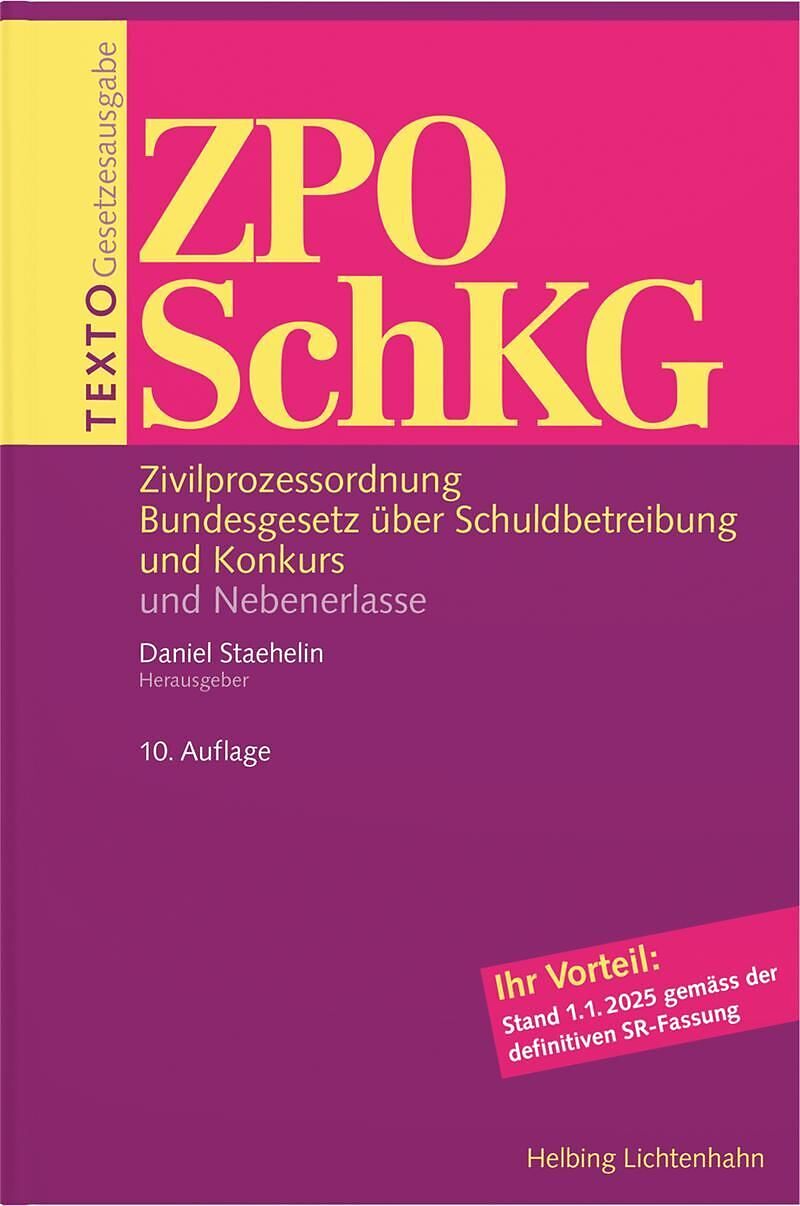 Zivilprozessordnung, Bundesgesetz über Schuldbetreibung und Konkurs und über 30 wichtige praxisrelevante Nebenerlasse in kompakter Form. Das Werk enthält zudem je in Form einer Einleitung eine Übersicht zum Zivilprozessrecht und zum SchKG sowie eine tabellaris...