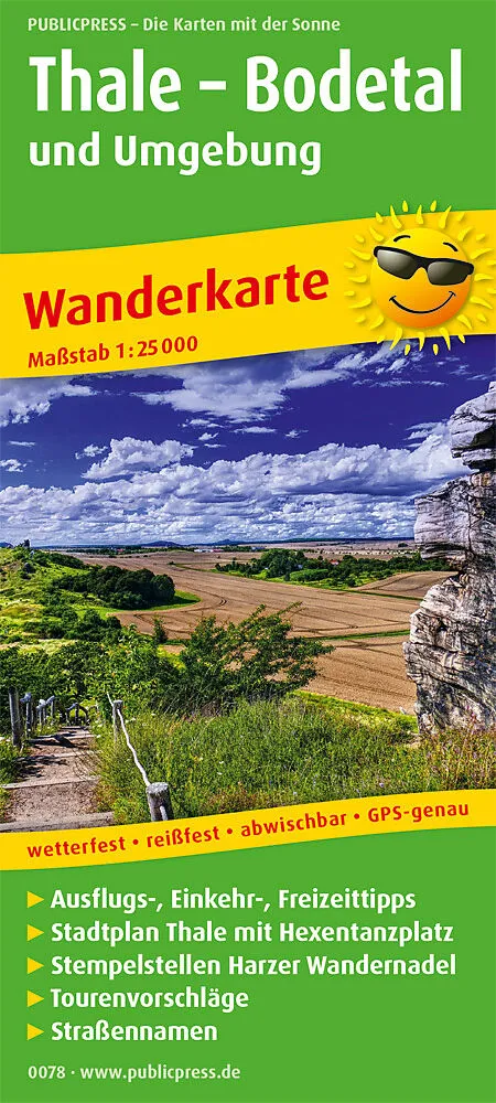 Thale, am Rande des Harzes gelegen, liegt im Zentrum des Kartenausschnitts. Eine Detailkarte über den Ort mit dem per Seilbahn erreichbaren Hexentanzplatz zeigt ihn als idealen Ausgangspunkt für den bekannten Harzer Hexenstieg. Weitere markierte Fernwanderwege...