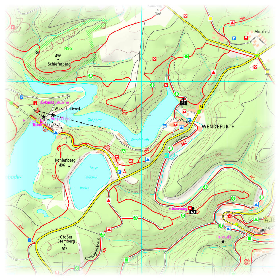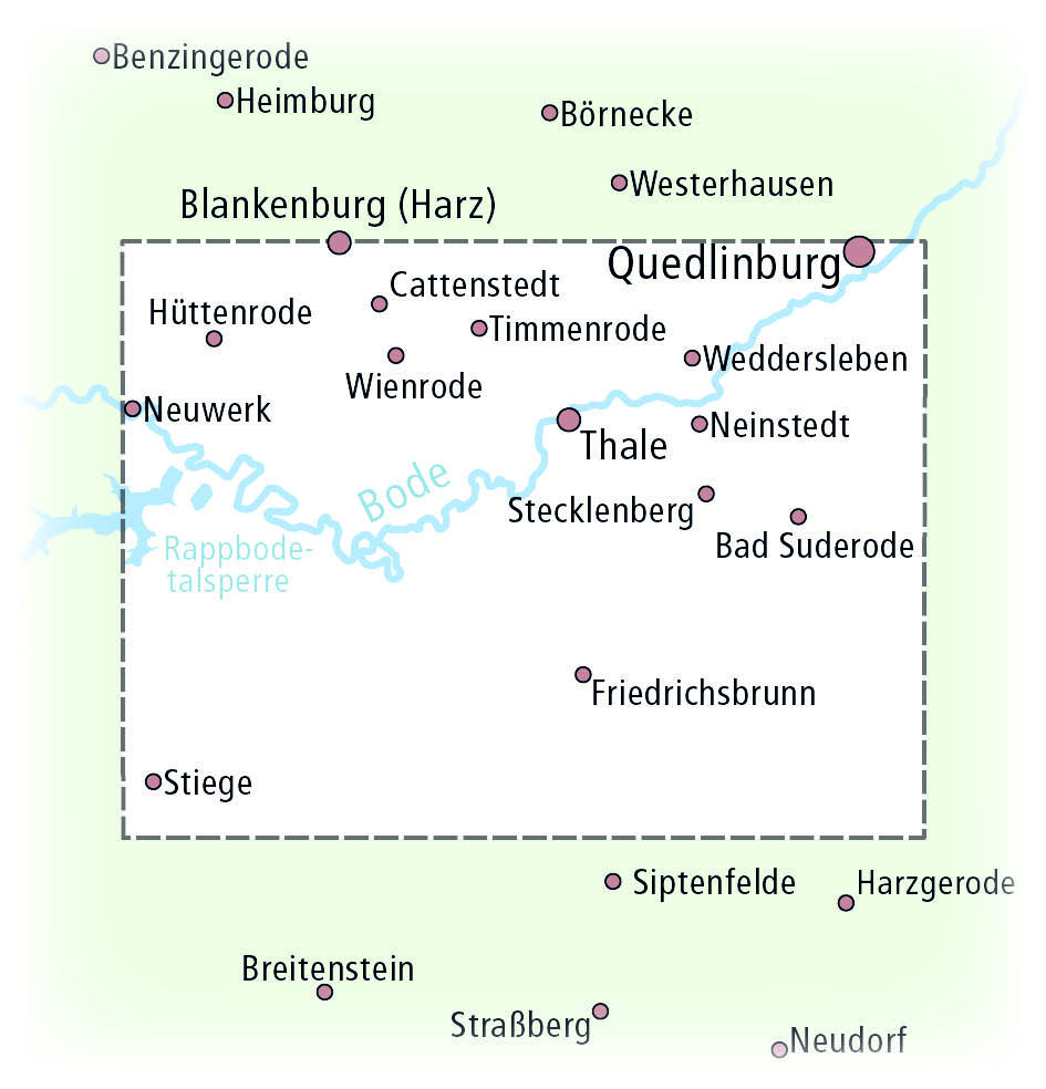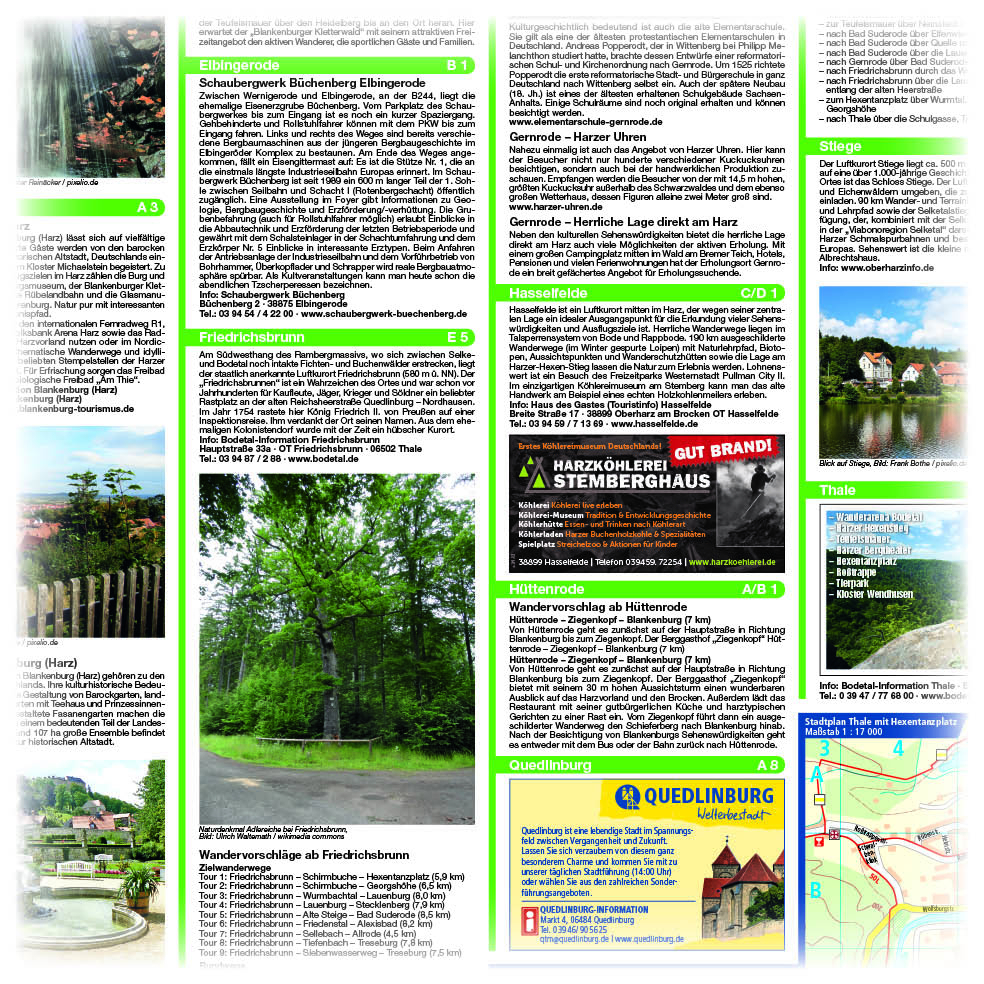 Thale, am Rande des Harzes gelegen, liegt im Zentrum des Kartenausschnitts. Eine Detailkarte über den Ort mit dem per Seilbahn erreichbaren Hexentanzplatz zeigt ihn als idealen Ausgangspunkt für den bekannten Harzer Hexenstieg. Weitere markierte Fernwanderwege...
