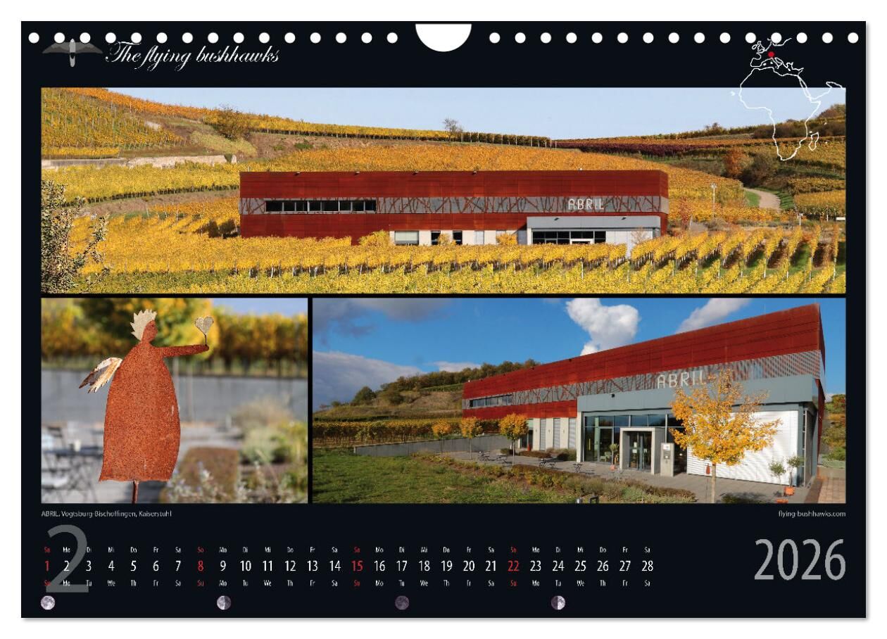 Western Cape trifft Kaiserstuhl Moderne Architektur und guter Wein haben vieles gemeinsam. Beide sind tief verwurzelt in Kultur, Kunst, Wissenschaft und Technologie. Der Kalender verbindet moderne Weingüter Südafrikas mit denen des Kaiserstuhls am Rhein. Genie...