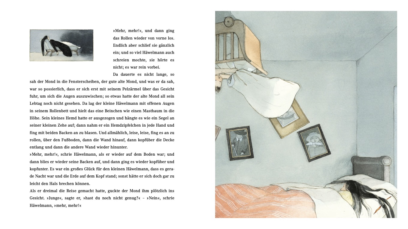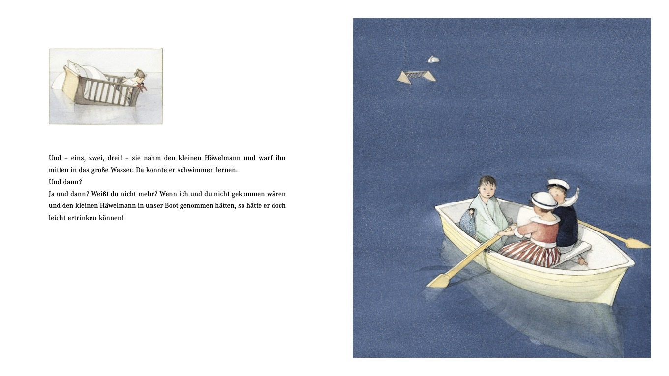 Der kleine Häwelmann kann nicht einschlafen. Er möchte, dass seine Mutter ihn in seinem Bettchen herumschiebt. Doch die schläft schon. Da verwandelt der Junge sein Bett in ein Traumschiff, sein Nachthemd wird zum Segel. Der Mond selbst schickt einen Lichtstra...
