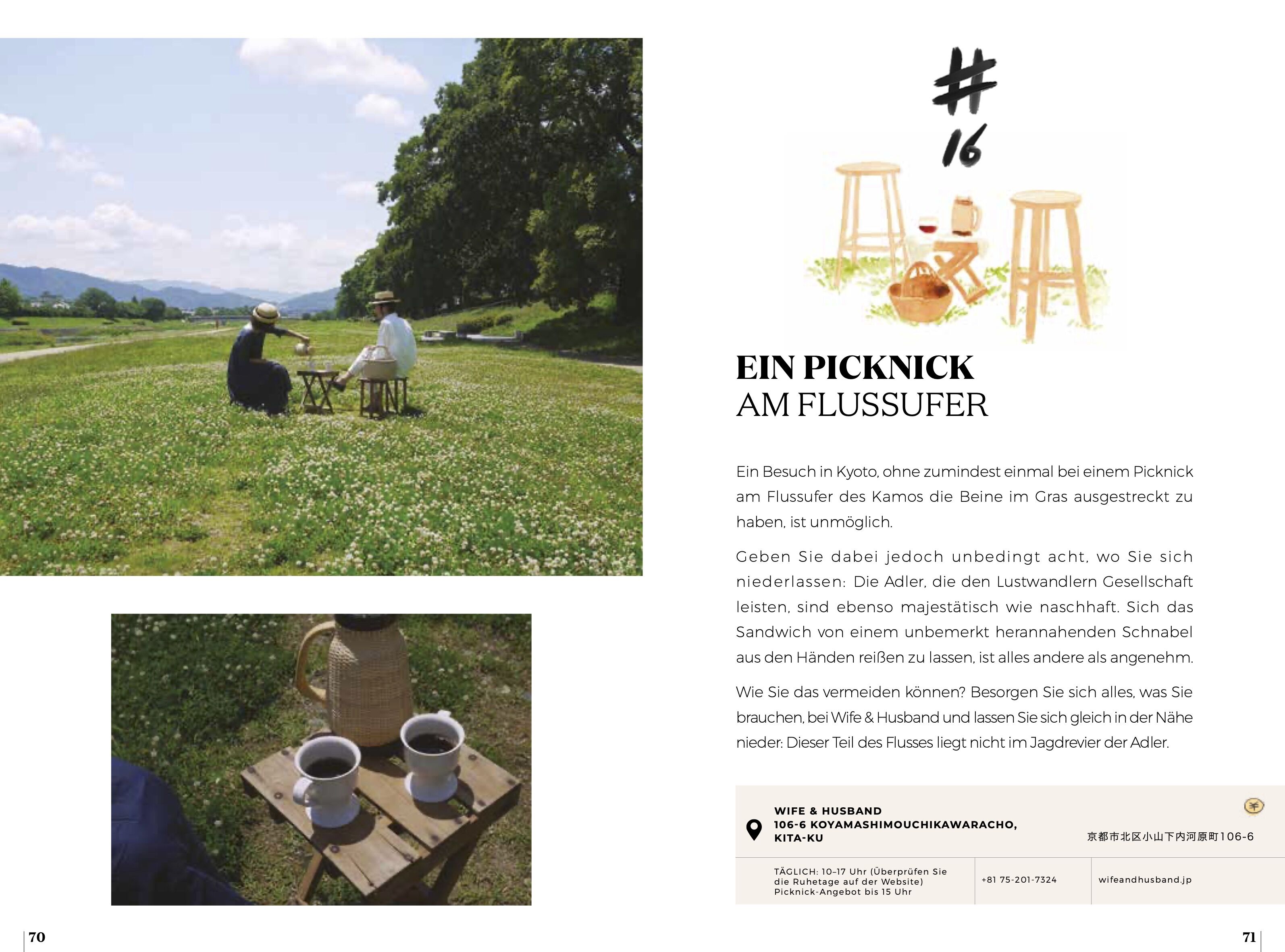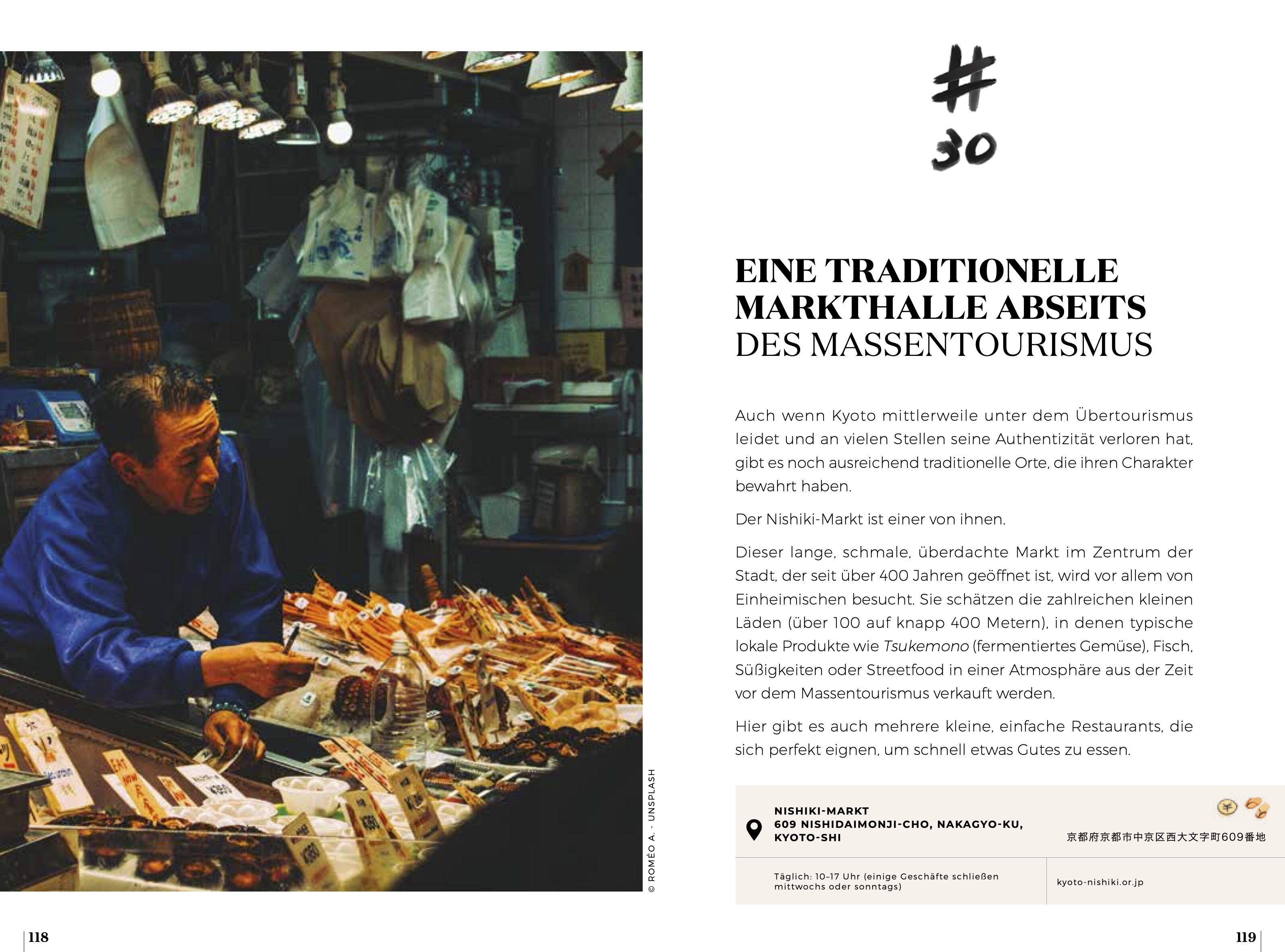 SOUL OF KYOTO- 30 ERLEBNISSE Wir haben 1000 Orte getestet und die 30 besten ausgewählt. Gerade eingekaufte Köstlichkeiten direkt hinter dem Fischmarkt grillen, eine Teezeremonie in einem Privathaus erleben, im Garten eines einzigartigen Tempels spazieren gehe...