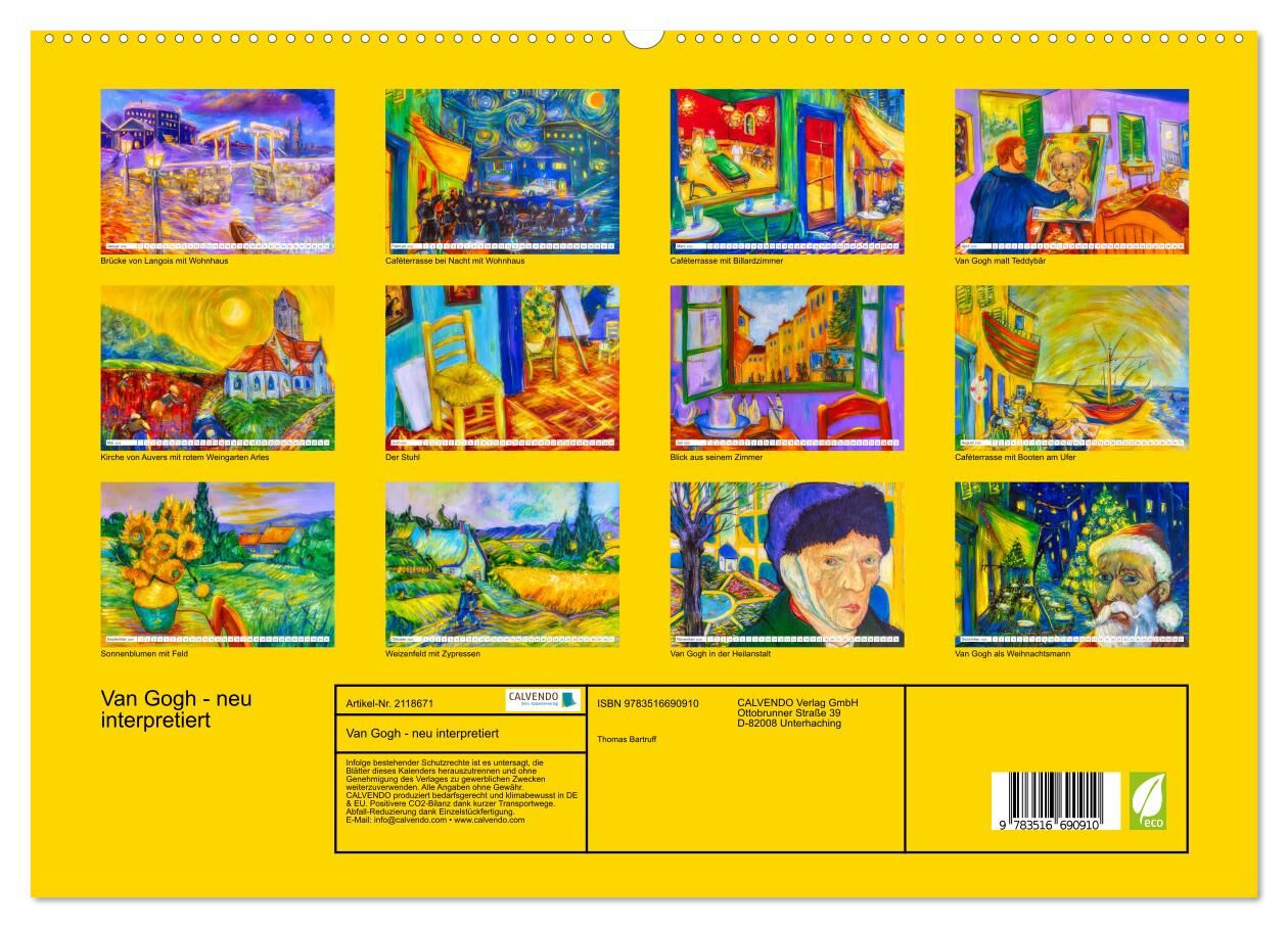 Van Gogh, wer kennt ihn nicht. In diesem Kalender wurden seine Werke von einem ortsansässigen Künstler neu interpretiert. In Zusammenarbeit mit dem Fotografen entstand ein farbenfrohes Potpourri , das mit einem Augenzwinkern an Van Gogh erinnert.