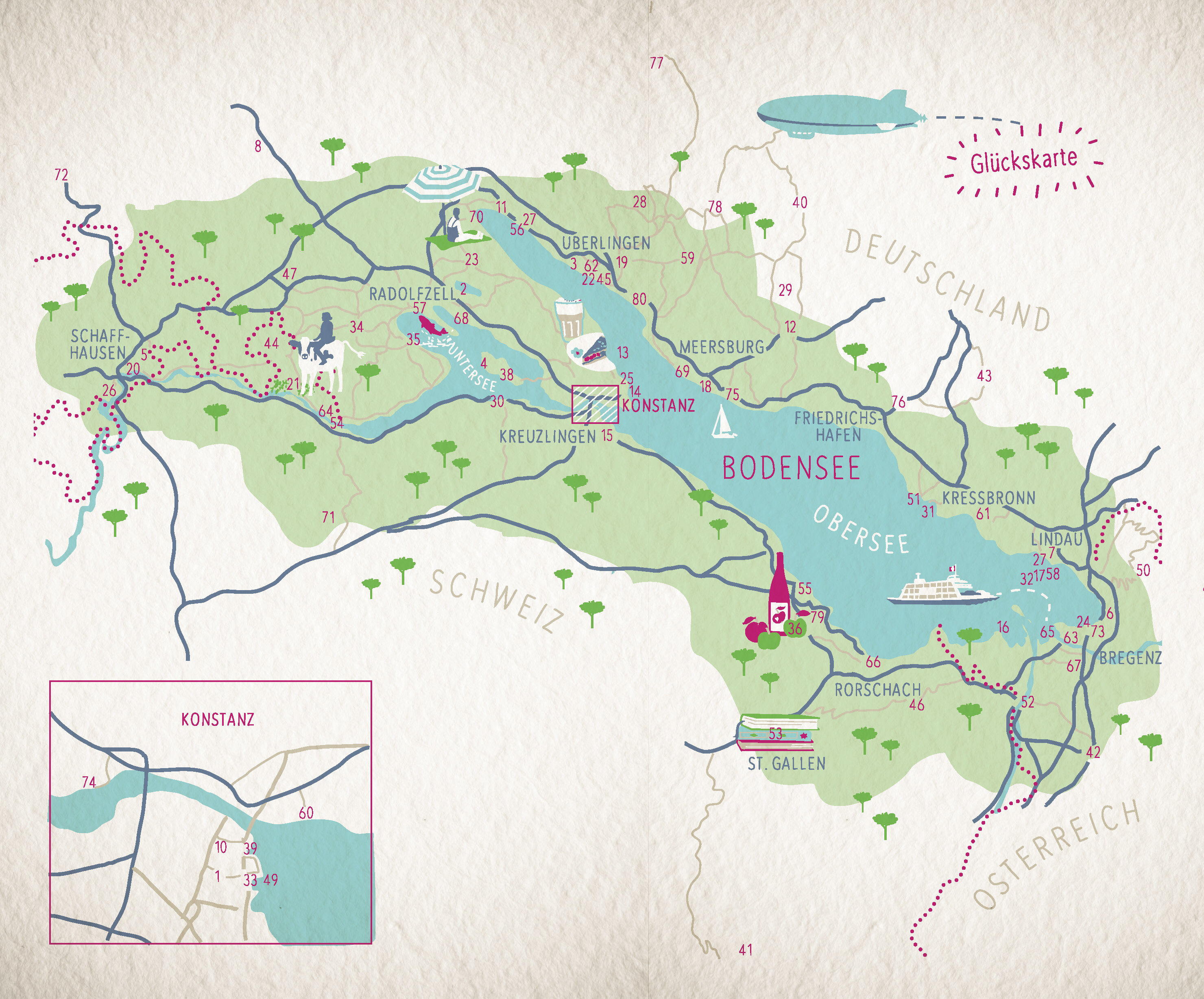 Auf einer Kuh reiten, Kässpätzle mit Aussicht genießen, eine Zeitreise auf Schienen unternehmen oder eine mystische kleine Insel besuchen - Glücksmomente gibt es rund um den Bodensee an jeder Ecke, man muss sie nur finden! Dafür hat Thomas Blasche gleich 80 Gl...