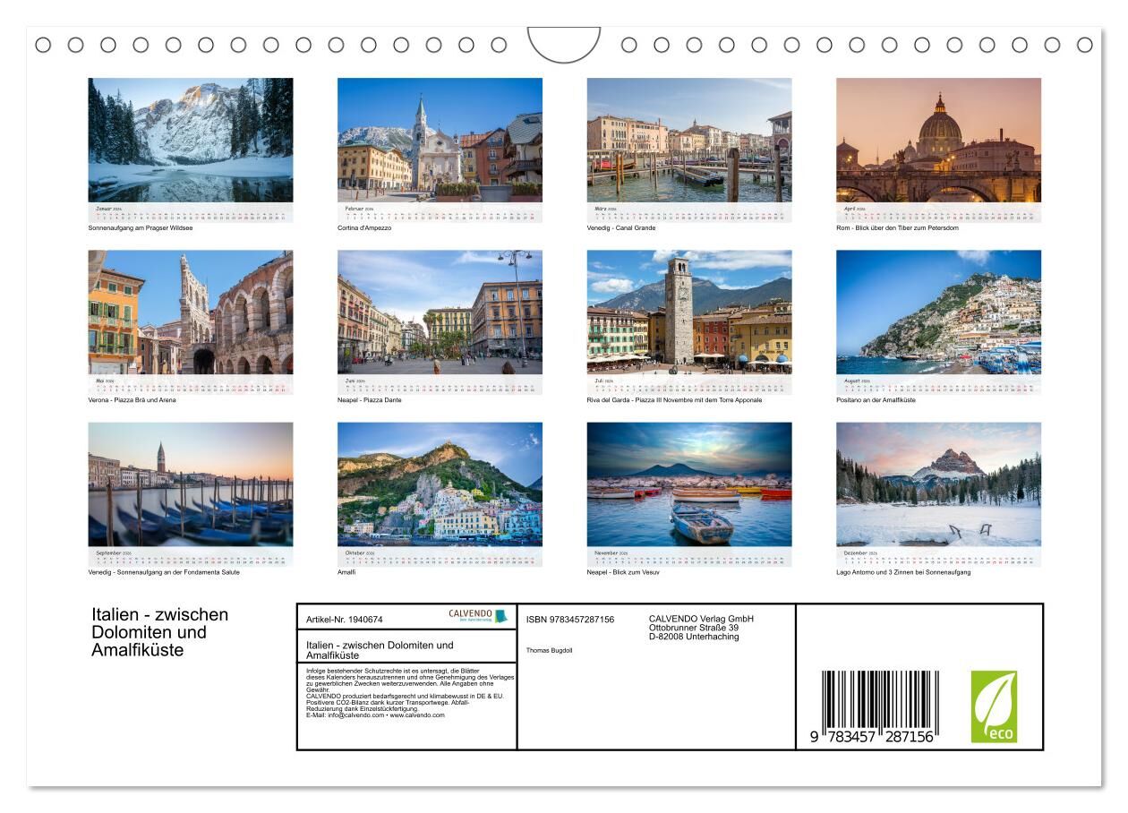 Erleben Sie die Schönheit Italiens Monat für Monat Lassen Sie sich von den faszinierenden Landschaften Italiens verzaubern! Unser exklusiver Fotokalender führt Sie auf eine visuelle Reise von den majestätischen Dolomiten im Norden bis zur traumhaften Amalfiküs...