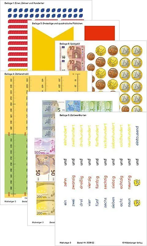 Die Arbeitsbeilagen aus Mathetiger 3 passend zur Heftausgabe (3506-20) und Buchausgabe (3506-60). Beilage 1: Einer, Zehner und Hunderter Beilage 2: Hunderter und Tausender Beilage 3: Zahlwortkarten Beilage 4: Zahlenstrahl Beilage 5: Dreieckige und quadratisch...
