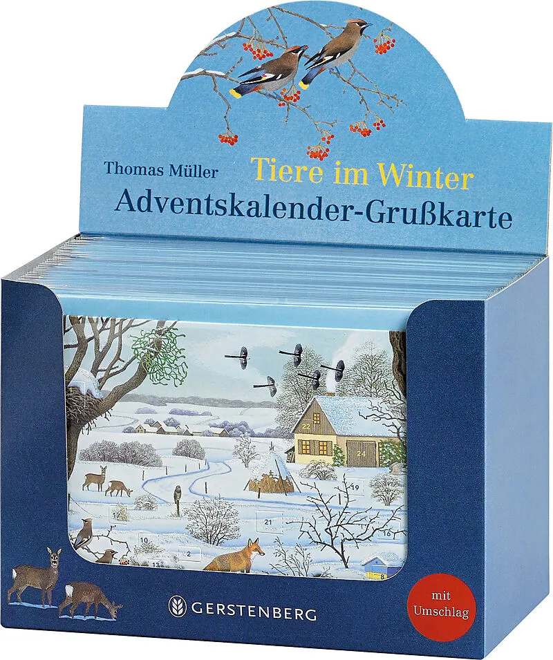 Ein netter Adventsgruß mit 24 kleinen Türchen auf der Vorderseite der Karte. Nur erhältlich als Verkaufseinheit mit 20 Karten plus farbigen Umschlägen. Diese adventliche Grußkarte lädt auf Entdeckungsreise in die verschneite Winterlandschaft ein. Wo verstecken...