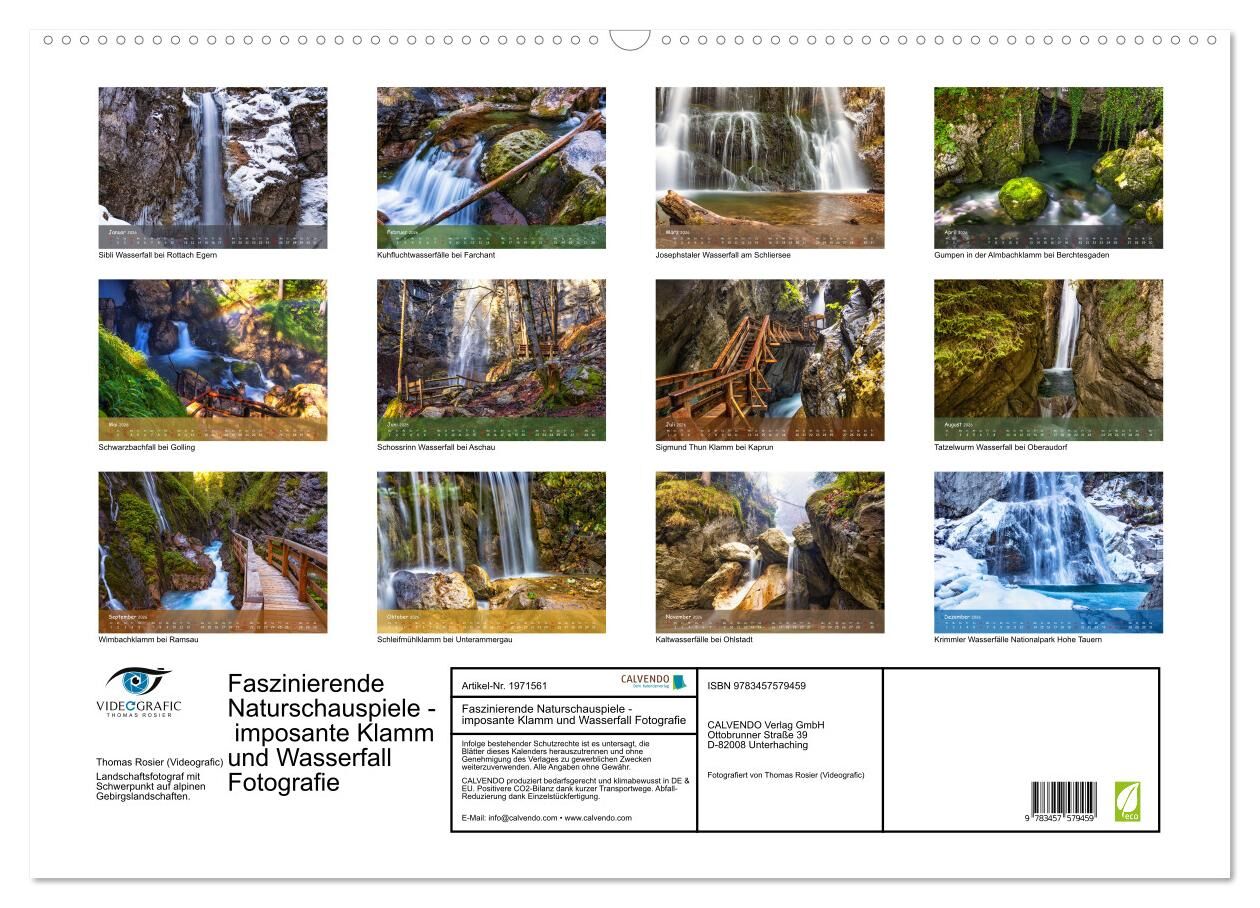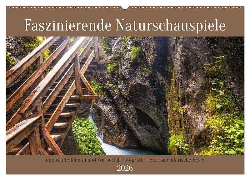 Kalendarische Reise mit technisch und kompositorisch hochwertigen Klamm und Wasserfall Landschaftsaufnahmen. Atemberaubende Natur, beeindruckendes Voralpenland, tolles Bergpanorama sowie vor allem faszinierende Naturschauspiele: all dies festgehalten in besond...