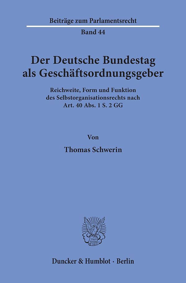 "Der Deutsche Bundestag als Geschäftsordnungsgeber" ist eine Studie, die sich mit einer Reihe von Grundlagenproblemen des Parlamentsrechts auseinandersetzt, von denen hier nur einige kursorisch herausgegriffen werden können. Untersucht werden die Beziehungen u...