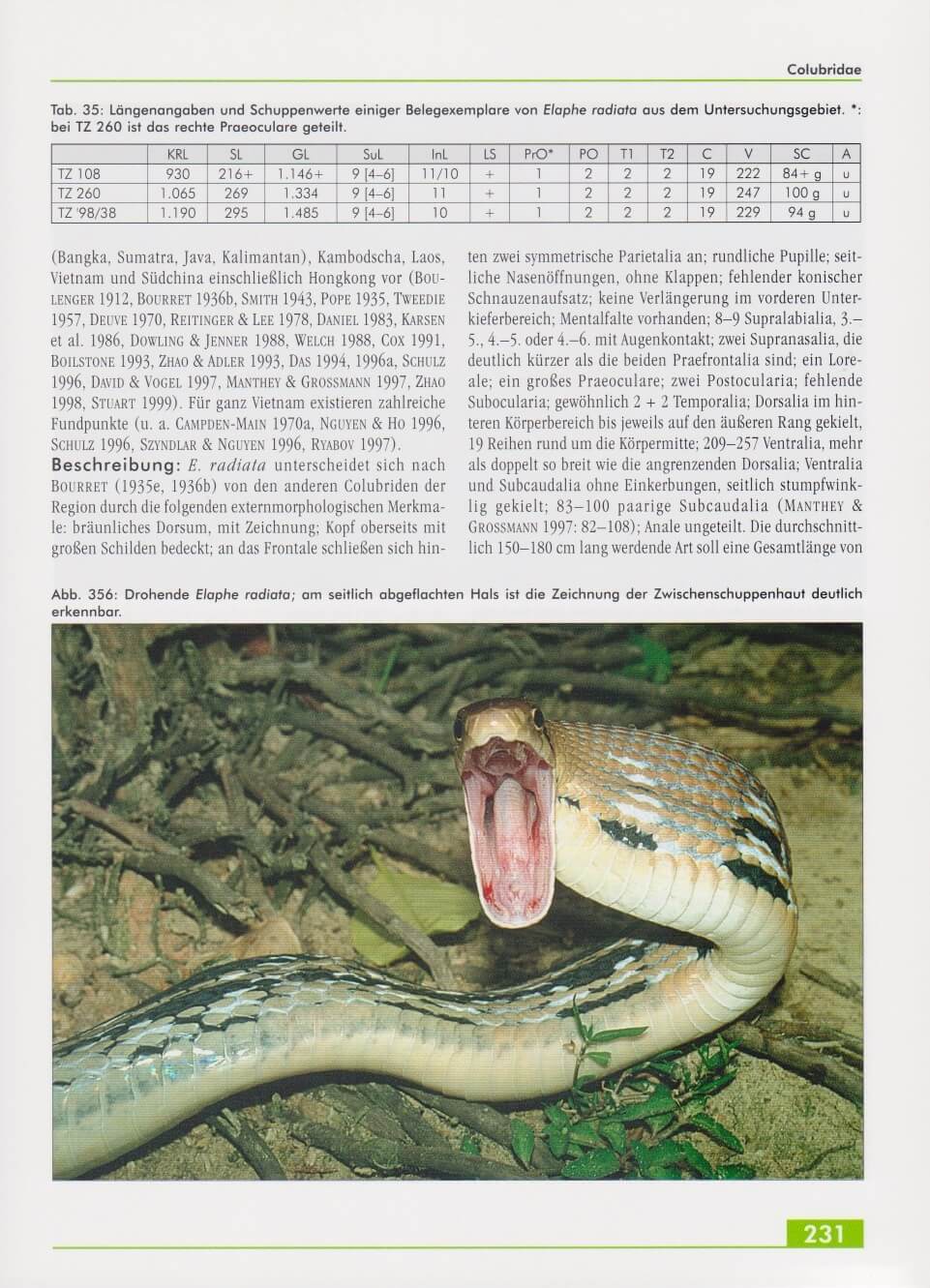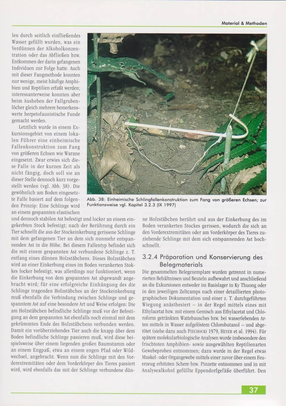 1 Einleitung 1.1 Entstehungsgeschichte und Zielsetzung der Arbeit 1.2 Vietnam 1.2.1 Geographie 1.2.2 Klima 1.2.3 Vegetationstypen 1.2.4 Biogeographie 1.2.5 Biodiversität - Gefährdung und Erhaltungsprojekte 1.3 Die Herpetofauna Vietnams und ihre Erforschungsgeschichte 2 Untersuchungsgebiete 2.1 Provinz Ha Tinh 2.1.1 Allgemeines 2.2.2 Klima 2.2.3 Tropischer Feuchtwald 2.2.4 Fauna 2.2 Ky Anh Ke Go Schutzgebiet 2.3 Exkursionsgebiete und Untersuchungszeiträume 3 Materialen & Methoden 3.1 Materialien 3.2 Methoden 3.2.1 Durchführung der Exkursionen 3.2.2. Datenaufnahmen 3.2.3 Fang und Sammelmethoden 3.2.4 Präparation und Konservierung des Belegmaterials 3.2.5 Bioakustik 3.2.6 Bestimmung und Nachbearbeitung des Belegmaterials 4 Artenübersicht 4.1 Allgemeines 4.2 Amphibia 4.2.1 Gymnophiona Ichthyophiidae Ichthyophis sp 4.2.2 Anura Megophryidae Leptobrachium chapaense (BOURRET, 1937) Leptolalax pelodytoides (BOULENGER, 1893) Megophrys lateralis(ANDERSON, 1871) Bufonidae Bufo galeatus (GÜNTHER, 1864) Bufo melanostictus (SCHNEIDER, 17999 Microhylidae Microhyla cf. annamensis (SMITH, 1923) Microhyla butleri (BOULENGER, 1900) Microhyla heymonsi (VOGT, 1911) Microhyla ornate (DUMERIL & BIRRON, 1841) Microhyla pulchra (HALLOWEL, 1861) Microhyla inornata (BOULENGER, 1890) Ranidae Hoplobatrachus rugolosus (WIEGMANN, 1841) Limnocestes kuhlii (TSCHUDI, 1838) Limnocestes limnocharis (GRAVENHORST, 1829) Occidozyga lima (GRAVENHORST, 1829) Phrynoglossus martensii (PETERS, 1867) Rana guentheri (BOULENGER, 1882) Rana johnsi (SMITH, 1921) Rana livida (BLYTH, 1856) Rana maosonensis (BOURRET, 1937) Rana nigrovittata (BLYTH, 1856) Rana cf. schmackeri BOETTGER, 1892 Taylorana hascheana (STLICZKA, 1870) Rhacophoridae Chirixalus vittatus (BOULENGER, 1887) Polypedates dennysi (BLANFORD, 1881) Polypedates leucomystax (GRAVENHORST, 1829) Polypedates sp. Rhacophorus reinwardtii (SCHLEGEL, 1837) Rhacophorus verrucosus (BOULENGER, 1893) Rhacophorus sp. 4.3 Reptilia 4.3.1 Testudines Bataguridae Cuora galbinifrons (BOURRET, 1939) Cyclemys tcheponensis (BOURRET, 1939) Mauremys mutica (CANTOR, 1842) Ocadia sinensis (GRAY, 1862) Pyxidae mouhotii (GRAY, 1862) Sacalia quadriocellata (SIEBENROCK, 1903) Platysternidae Platysternon megacephalum (GRAY, 1831) Testudinidae Indotestudo elongate (BLYTH, 1853 Trionychidae Palea steindachneri Pelodiscus sinensis (WIEGMANN, 1834) 4.3.2 Squamata: Sauria Gekkonidae Gekko gecko (LINNAEUS, 1785) Hemidactylus frenatus (DUMERIL & BIRRON, 1836) Agamidae Acanthosaura lepidogaster (DUMERIL & BIRRON, 1836) Calotes emma (GRAY, 1845) Draco maculatus (GRAY, 1845) Physignathus cocincinus (CUVIER, 1829) Varanidae Varanus salvator (LAURENTI, 1768) Lacertidae Takydromus kuehni (VAN DENBURGH, 1909) Scincidae Mabuya longicaudata (HALLOWELL, 1856) Mabuya macularia (BLYTH, 1853) Mabuya multifaciate (KUHL, 1820) Scincella reevesii (GRAY, 1838) Sphenomorphus indicus (GRAY, 1853) Tropidophorus sp. 4.3.3 Squamata: Serpentes Typhlopidae Ramphotyphlops braminus (DAUDIN, 1803) Xenopeltidae Xenopeltis unicolor (BOI, 1827) Boidae Python reticulatus (SCHNEIDER, 1801) Colubridae Achalnus rufescens (BOULENGER, 1888) Ahaetulla prasina (BOI, 1827) Amphiesma sp. Boiga kraepelini (STEJNEGER, 1902) Calamaria pavimentata (DUMERIL, BIRRON& DUMERIL, 1854) Cyclophiops multicinctus (ROUX, 1907) Dendrelaphis ngansonensis (BOURRET, 1935) Dinodon cf. rufozonatum (CANTOR, 1842) Elaphe radiate (BOI, 1827) Elaphe taeniura (COPE, 1861) Enhydris chinensis (GRAY, 1842) Enhydris plumbea (BOIE, 1827) Lycodon ruhstrati (FISCHER, 1886) Oligon sp Pareas hamptoni (BOULENGER, 1905) Pareas margoriphorus (JAN, 1866) Psammodynastes pulverulentus (BOIE, 1827) Ptyas korros (SCHLEGEL, 1837) Ptyas mucosus (LINNAEUS, 1758) Rhabdophis chrysargos (SCHLEGEL, 1837) Rhabdophis subminiatus (SCHLEGEL, 1837) Rhadophis sp. Sinonatrix percarinata (BOULENGER, 1899) Xenochrophis piscator (SCHNEIDER, 1799) Elapidae Bungarus fasciatus (SCHNEIDER, 1801) Bungarus multicinctus (BLYTH, 1861) Naja atra (CANTOR, 1842) Ophiophagus hannah (CANTOR, 1836) Viperidae Protobothrops mucrosquamatus (CANTOR, 1839) Trimeresurus albolabris (GRAY, 1842) Trimeresurus stejnegeri (SCHMIDT, 1925) 4.4 Hinweise auf weiteren Arten 5 Artenvielfalt 5.1 Artenenzahlen 5.2 Häufigkeiten 6 Einnischung 6.1 Verteilungsmuster und Herpetozönosen 6.2 Nahrungsspektrum 6.2.1 Allgemeines 6.2.2 Amphibia 6.2.3 Sauria 6.2.4 Serpentes 6.3 Fortpflanzung 6.3.1 Allgemeines 6.3.2 Amphibia 6.3.3 Reptilia 7 Zoogeographische Anmerkungen 8 Tierhandel 9 Danksagungen 10 Fußnotennachträge 11 Literaturverzeichnisse