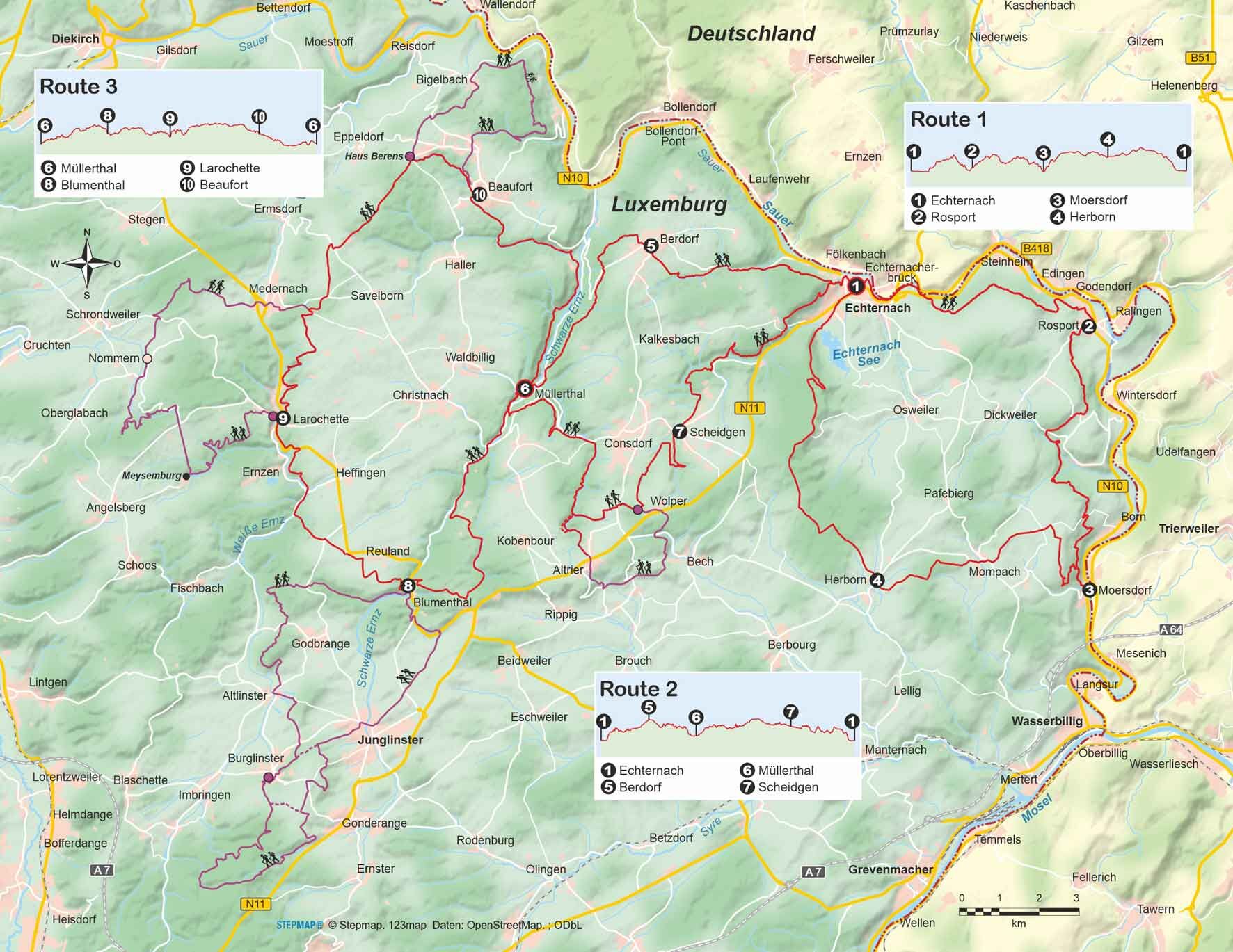 Rund um Luxemburgs älteste Stadt Echternach erschließen gut 110 abwechslungsreiche Wanderkilometer die Region Müllerthal/Kleine Luxemburger Schweiz. Auf drei zusammenhängenden Schlaufen wandern Sie durch spektakuläre Felslandschaften, Wälder, Wiesen und idylli...